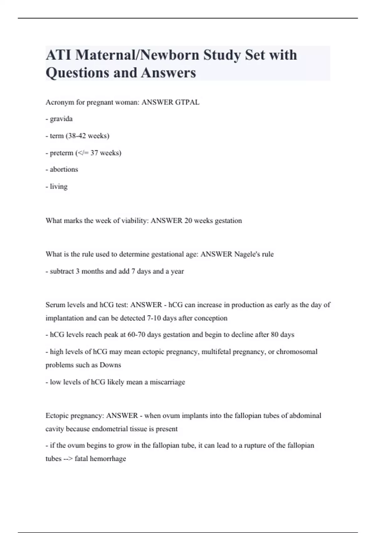 ATI Maternal/Newborn Study Set with Questions and Answers Acronym for pregnant woman: ANSWER GTPAL - gravida - term (38-42 weeks) - preterm (/= 37 weeks) - abortions - living What marks the week of viability: ANSWER 20 weeks gestation What is the rule used to determine gestational age: ANSWER Nagele's rule - subtract 3 months and add 7 days and a year Serum levels and hCG test: ANSWER - hCG can increase in production as early as the day of implantation and can be detected 7-10 days after conception - hCG levels reach peak at 60-70 days gestation and begin to decline after 80 days - high levels of hCG may mean ectopic pregnancy, multifetal pregnancy, or chromosomal problems such as Downs - low levels of hCG likely mean a miscarriage Ectopic pregnancy: ANSWER - when ovum implants into the fallopian tubes of abdominal cavity because endometrial tissue is present - if the ovum begins to grow in the fallopian tube, it can lead to a rupture of the fallopian tubes -- fatal hemorrhage