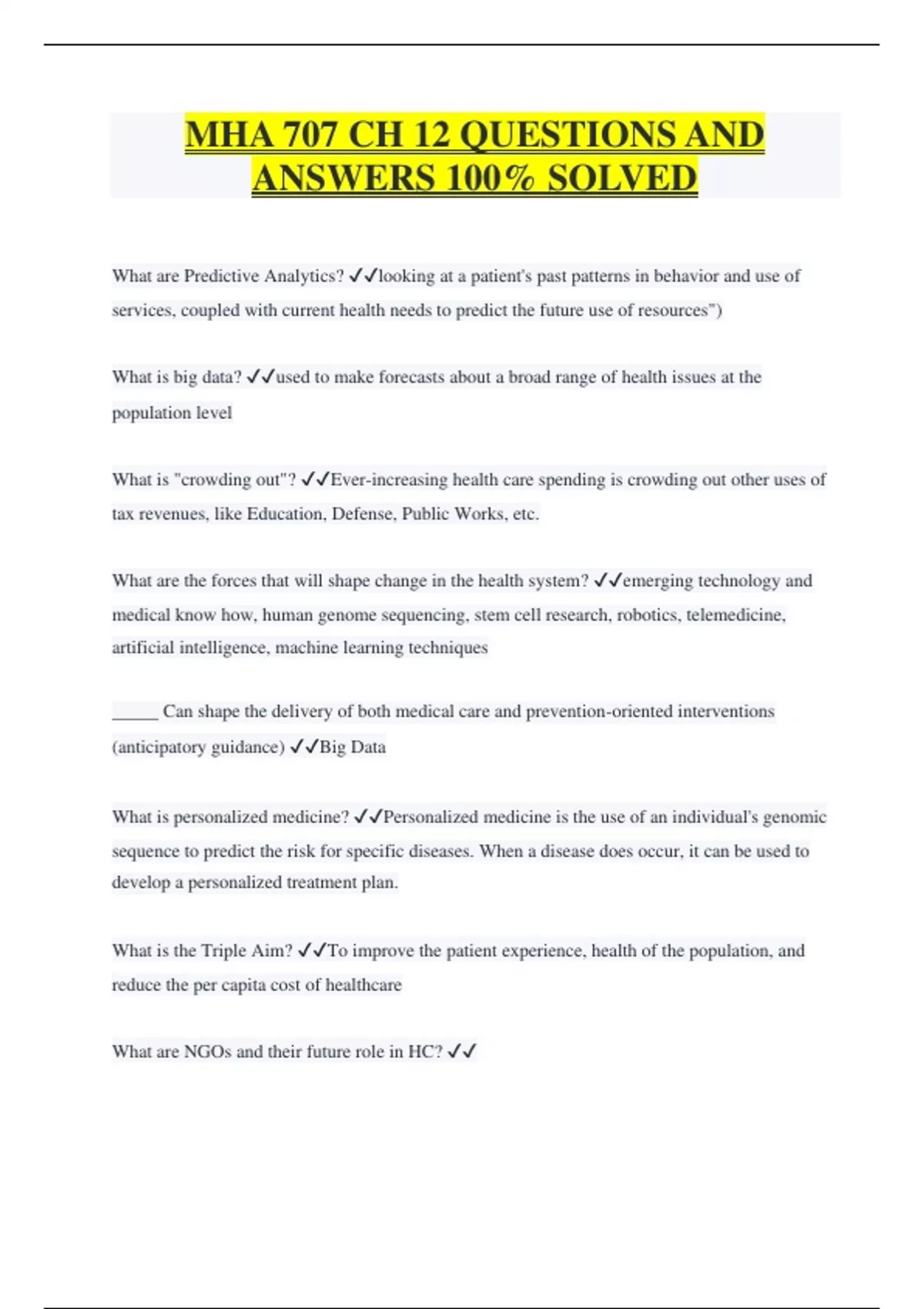 MHA 707 CH 12 QUESTIONS AND ANSWERS 100% SOLVED What are Predictive Analytics? looking at a patient's past patterns in behavior and use of services, coupled with current health needs to predict the future use of resources") What is big data? used to make forecasts about a broad range of health issues at the population level What is "crowding out"? Ever-increasing health care spending is crowding out other uses of tax revenues, like Education, Defense, Public Works, etc. What are the forces that will shape change in the health system? emerging technology and medical know how, human genome sequencing, stem cell research, robotics, telemedicine, artificial intelligence, machine learning techniques _____ Can shape the delivery of both medical care and prevention-oriented interventions (anticipatory guidance) Big Data What is personalized medicine? Personalized medicine is the use of an individual's genomic sequence to predict the risk for specific diseases. When a disease does occur, it can be used to develop a personalized treatment plan. What is the Triple Aim? To improve the patient experience, health of the population, and reduce the per capita cost of healthcare