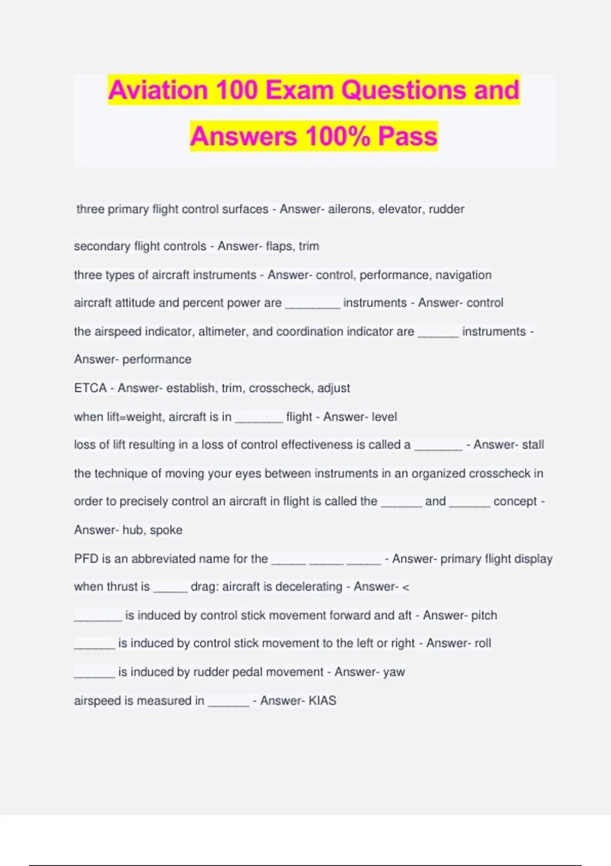 Aviation 100 Exam Questions and Answers 100% Pass three primary flight control surfaces - Answer- ailerons, elevator, rudder secondary flight controls - Answer- flaps, trim three types of aircraft instruments - Answer- control, performance, navigation aircraft attitude and percent power are ________ instruments - Answer- control the airspeed indicator, altimeter, and coordination indicator are ______ instruments - Answer- performance ETCA - Answer- establish, trim, crosscheck, adjust when lift=weight, aircraft is in _______ flight - Answer- level loss of lift resulting in a loss of control effectiveness is called a _______ - Answer- stall the technique of moving your eyes between instruments in an organized crosscheck in order to precisely control an aircraft in flight is called the ______ and ______ concept - Answer- hub, spoke PFD is an abbreviated name for the _____ _____ _____ - Answer- primary flight display when thrust is _____ drag: aircraft is decelerating - Answer- _______ is induced by control stick movement forward and aft - Answer- pitch ______ is induced by control stick movement to the left or right - Answer- roll ______ is induced by rudder pedal movement - Answer- yaw airspeed is measured in ______ - Answer- KIAS a constant airspeed climb in the T-53 is flown in _____ power, at ______ KIAS - Answer- max, 85 level offs in the T-53 normally begin ~_____ feet below the desired attitude - Answer- 50 to maintain level flight at 90 KIAS in the T-53, initially set _______% power - Answer- 45 the altitude we read in our altimeter is in feet _____ _____ _____ - Answer- mean sea level an aircraft lying in high terrain must consider not only the altitude indicated in their altimeter, but also their altitude _____ _____ _____ - Answer- above ground level for a T-53 that weights 2500 lbs, the glide indicated airspeed is _____KIAS - Answer- 95 The T-53 glide ratio is _____:_____. This equates to a glide capability of _____NM for every _____ feet above the ground, and assumes a _____ _____ condition - Answer- 9:1, 1.5, 1000, no wind to counteract the left turning tendencies of the T-53 you mu