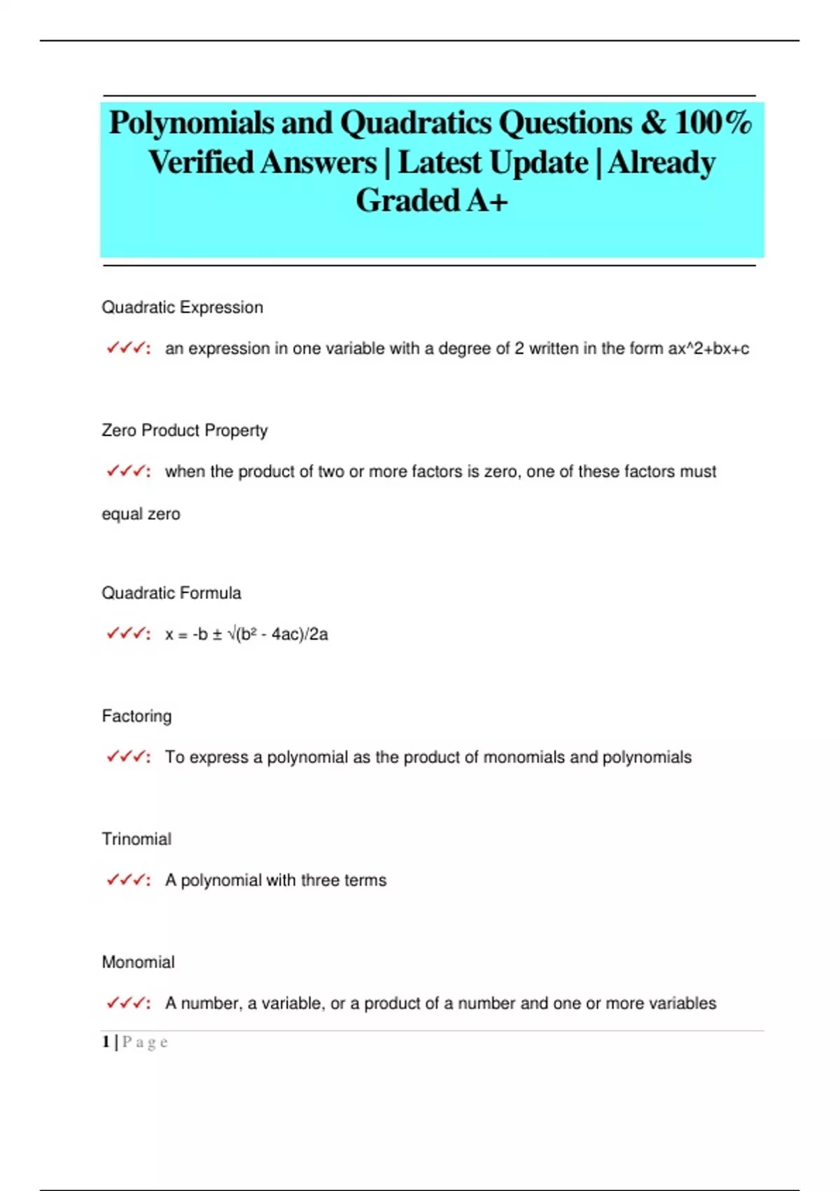 Polynomials and Quadratics Questions & 100% Verified Answers | Latest Update | Already Graded A+