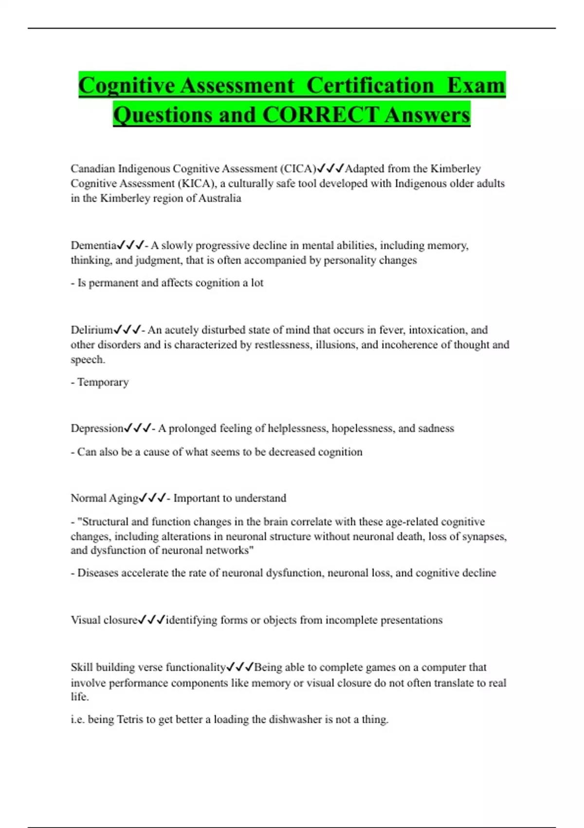 Cognitive Assessment Certification Exam Questions and CORRECT Answers