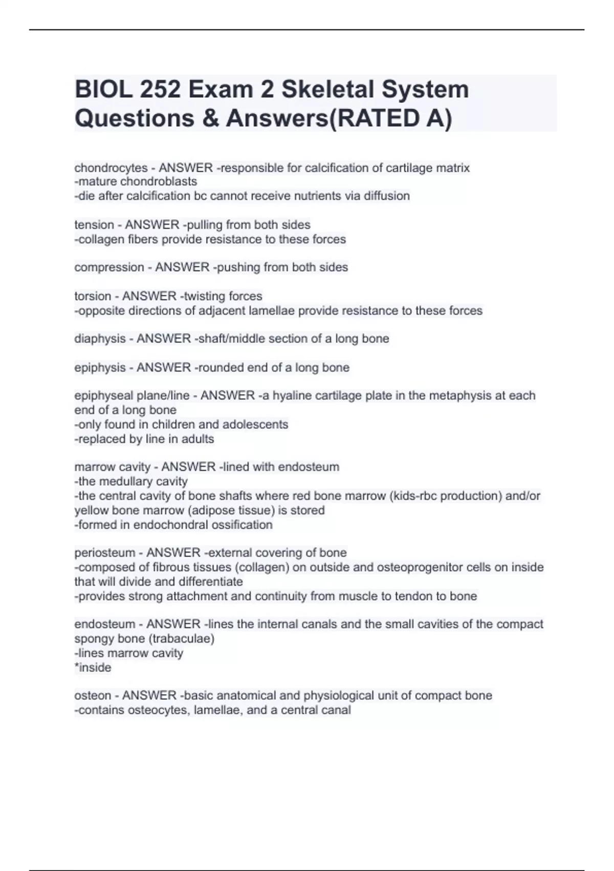 chondrocytes - ANSWER -responsible for calcification of cartilage matrix -mature chondroblasts -die after calcification bc cannot receive nutrients via diffusion tension - ANSWER -pulling from both sides -collagen fibers provide resistance to these forces compression - ANSWER -pushing from both sides torsion - ANSWER -twisting forces -opposite directions of adjacent lamellae provide resistance to these forces diaphysis - ANSWER -shaft/middle section of