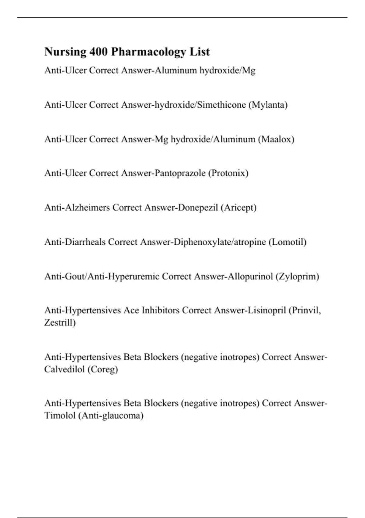 Anti-Ulcer Correct Answer-Mg hydroxide/Aluminum (Maalox)