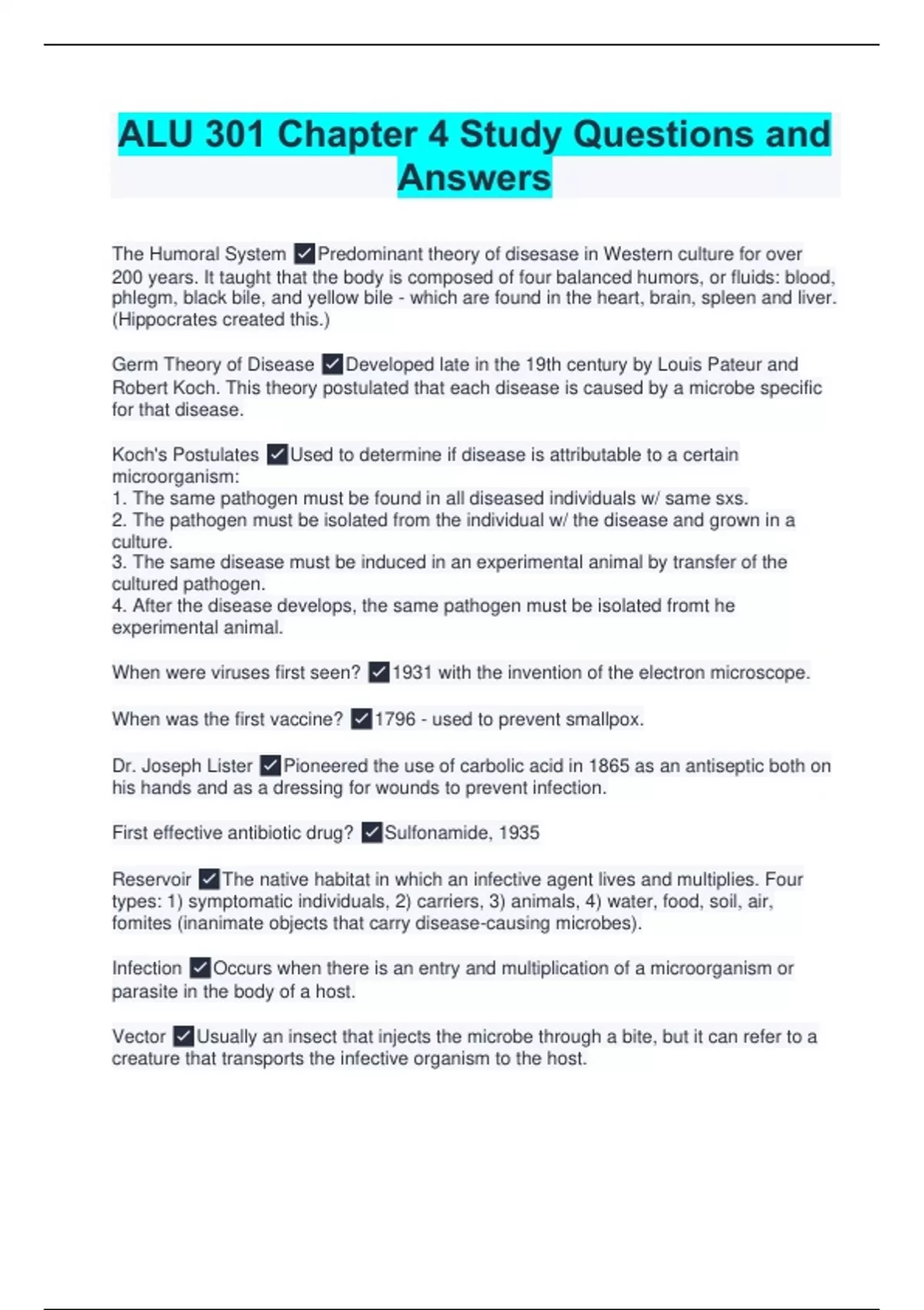 The Humoral System Predominant theory of disesase in Western culture for over 200 years. It taught that the body is composed of four balanced humors, or fluids: blood, phlegm, black bile, and yellow bile - which are found in the heart, brain, spleen and liver. (Hippocrates created this.) Germ Theory of Disease Developed late in the 19th century by Louis Pateur and Robert Koch. This theory postulated that each disease is caused by a microbe specific for that disease. Koch's Postulates Used to determine if disease is attributable to a certain microorganism: 1. The same pathogen must be found in all diseased individuals w/ same sxs. 2. The pathogen must be isolated from the individual w/ the disease and grown in a culture. 3. The same disease must be induced in an experimental animal by transfer of the cultured pathogen. 4. After the disease develops, the same pathogen must be isolated fromt he experimental animal. When were viruses first seen? 1931 with the invention of the electron microscope. When was the first vaccine? 1796 - used to prevent smallpox. Dr. Joseph Lister Pioneered the use of carbolic acid in 1865 as an antiseptic both on his hands and as a dressing for wounds to prevent infection. First effective antibiotic drug? Sulfonamide, 1935 Reservoir The native habitat in which an infective agent lives and multiplies. Four types: 1) symptomatic individuals, 2) carriers, 3) animals, 4) water, food, soil, air, fomites (inanimate objects that carry disease-causing microbes). Infection Occurs when there is an entry and multiplication of a microorganism or parasite in the body of a host. Vector Usually an insect that injects the microbe through a bite, but it can refer to a creature that transports the infective organism to the host.