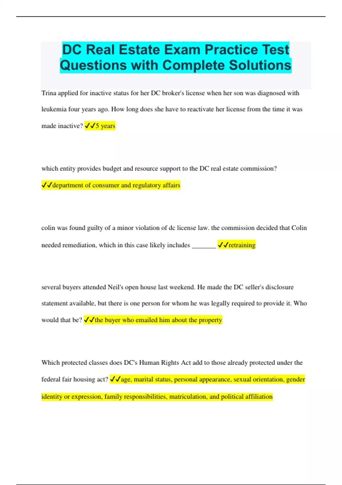 DC Real Estate Exam Practice Test Questions with Complete Solutions
