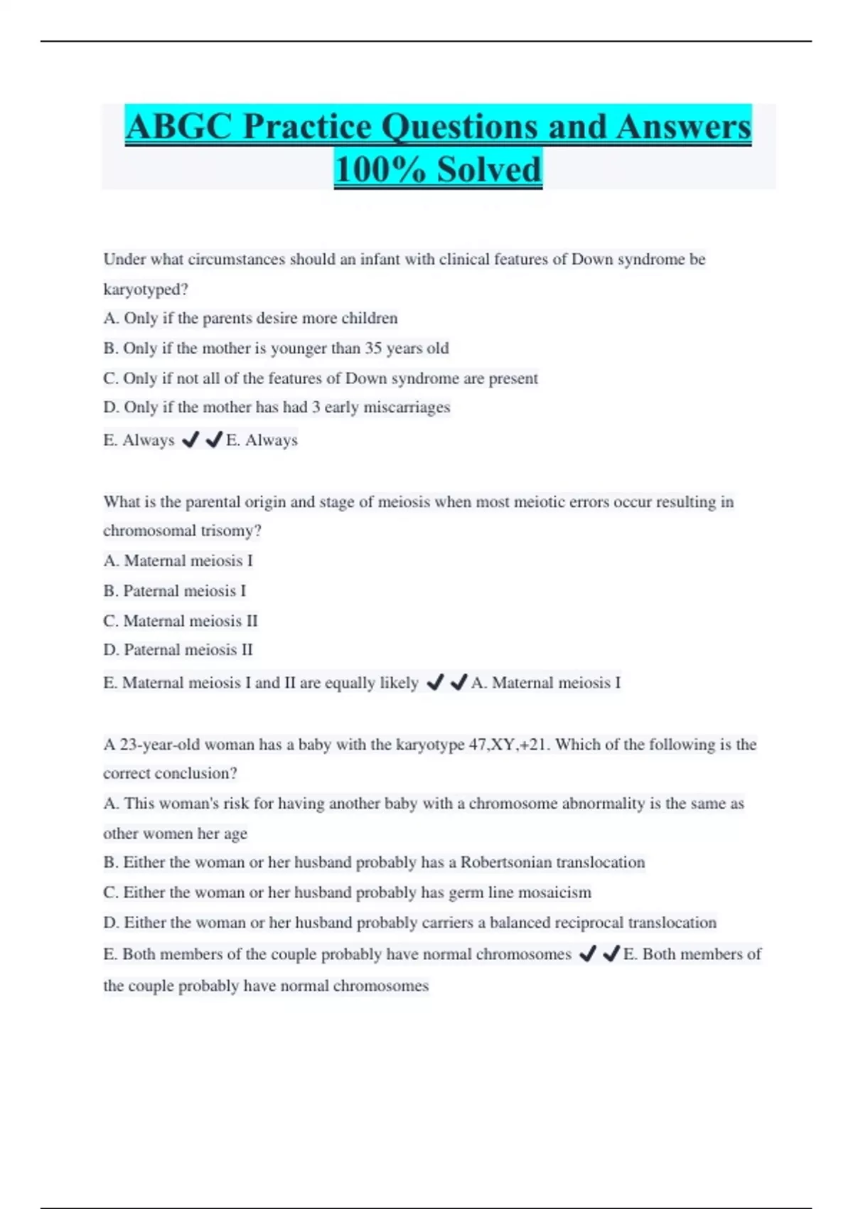 ABGC Practice Questions and Answers 100% Solved Under what circumstances should an infant with clinical features of Down syndrome be karyotyped? A. Only if the parents desire more children B. Only if the mother is younger than 35 years old C. Only if not all of the features of Down syndrome are present D. Only if the mother has had 3 early miscarriages E. Always ️️E. Always What is the parental origin and stage of meiosis when most meiotic errors occur resulting in chromosomal trisomy? A. Maternal meiosis I B. Paternal meiosis I C. Maternal meiosis II D. Paternal meiosis II E. Maternal meiosis I and II are equally likely ️️A. Maternal meiosis I