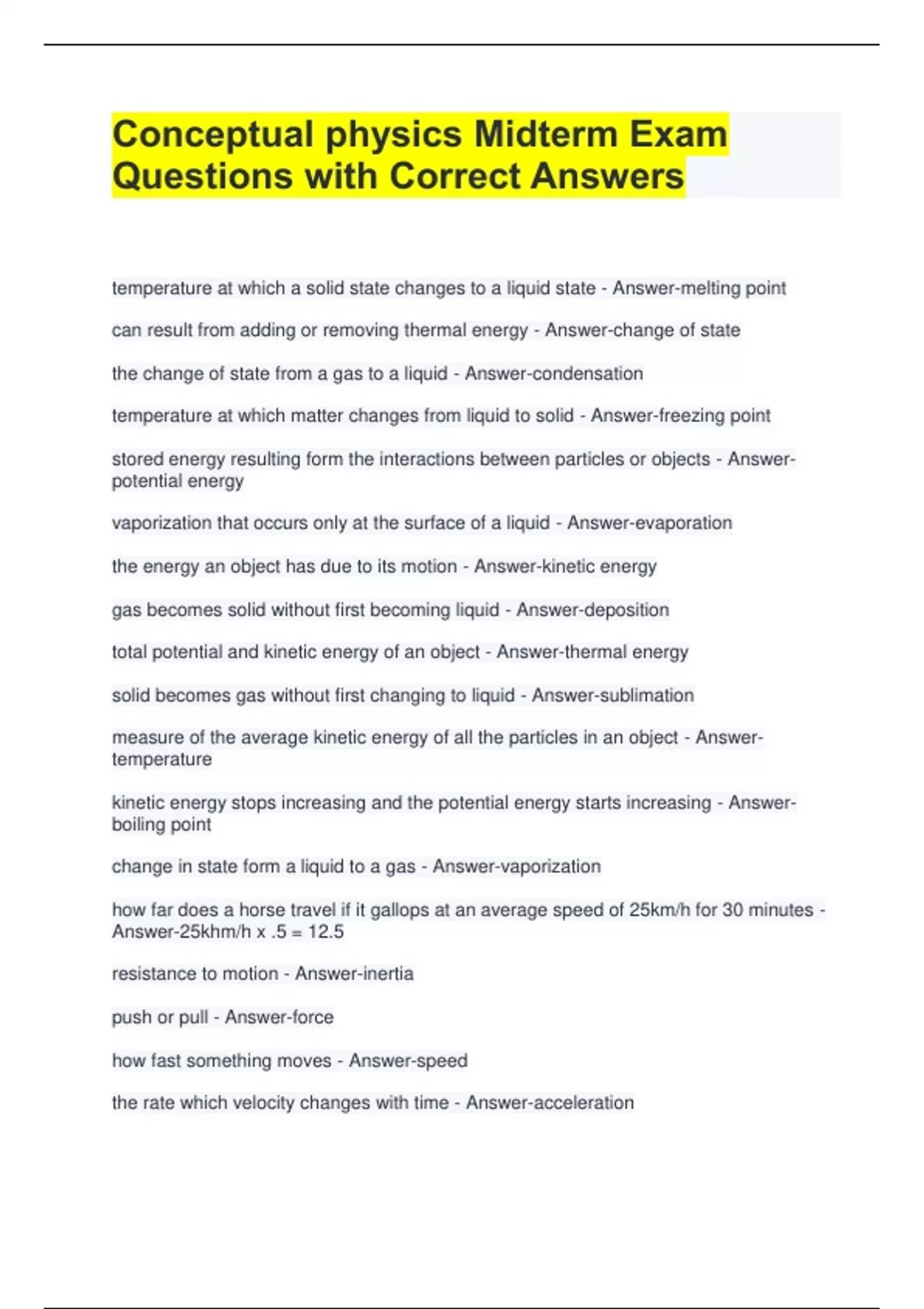 Conceptual physics Midterm Exam Questions with Correct Answers temperature at which a solid state changes to a liquid state - Answer-melting point can result from adding or removing thermal energy - Answer-change of state the change of state from a gas to a liquid - Answer-condensation temperature at which matter changes from liquid to solid - Answer-freezing point stored energy resulting form the interactions between particles or objects - Answerpotential energy vaporization that occurs only at the surface of a liquid - Answer-evaporation the energy an object has due to its motion - Answer-kinetic energy gas becomes solid without first becoming liquid - Answer-deposition total potential and kinetic energy of an object - Answer-thermal energy solid becomes gas without first changing to liquid - Answer-sublimation measure of the average kinetic energy of all the particles in an object - Answertemperature kinetic energy stops increasing and the potential energy starts increasing - Answerboiling point change in state form a liquid to a gas - Answer-vaporization how far does a horse travel if it gallops at an average speed of 25km/h for 30 minutes - Answer-25khm/h x .5 = 12.5 resistance to motion - Answer-inertia push or pull - Answer-force how fast something moves - Answer-speed the rate which velocity changes with time - Answer-acceleration speed of an object in a given direction - Answer-velocity total distance traveled by the time of travel - Answer-average speed henry weighs 1200N and stands on a pair of scales so that one scale reads twice as much as the other. What are the scale readings - Answer-400N and 800N Archimedes principle states that - Answer-an object immersed in a fluid is buoyed up by a force equal to the weight of the displaced fluid one morning you discover that a tire on your auto is in need of air. As you add air to the tire, what happens. - Answer-the pressure of the air in the tire increases, the number of moles of air in the tire increases, and the density of the air in the tire increased