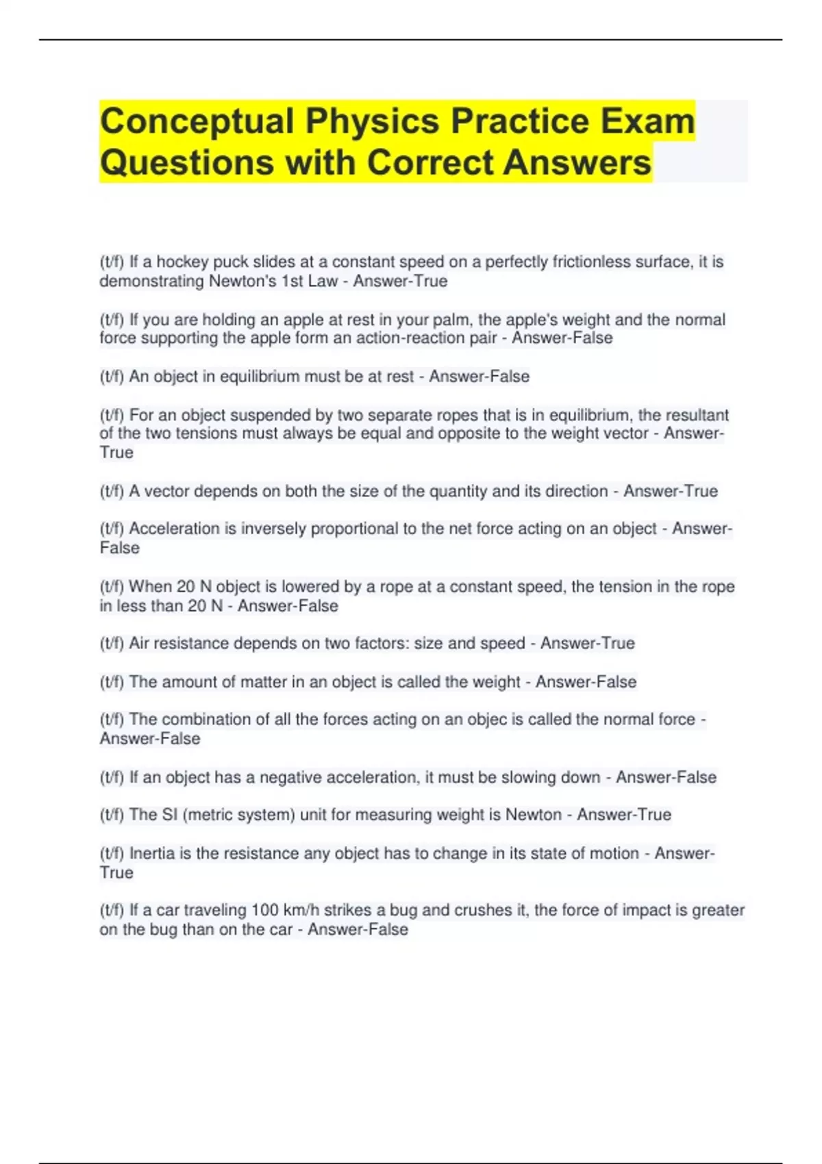 Conceptual Physics Practice Exam Questions with Correct Answers (t/f) If a hockey puck slides at a constant speed on a perfectly frictionless surface, it is demonstrating Newton's 1st Law - Answer-True (t/f) If you are holding an apple at rest in your palm, the apple's weight and the normal force supporting the apple form an action-reaction pair - Answer-False (t/f) An object in equilibrium must be at rest - Answer-False (t/f) For an object suspended by two separate ropes that is in equilibrium, the resultant of the two tensions must always be equal and opposite to the weight vector - AnswerTrue (t/f) A vector depends on both the size of the quantity and its direction - Answer-True (t/f) Acceleration is inversely proportional to the net force acting on an object - AnswerFalse (t/f) When 20 N object is lowered by a rope at a constant speed, the tension in the rope in less than 20 N - Answer-False (t/f) Air resistance depends on two factors: size and speed - Answer-True (t/f) The amount of matter in an object is called the weight - Answer-False (t/f) The combination of all the forces acting on an objec is called the normal force - Answer-False (t/f) If an object has a negative acceleration, it must be slowing down - Answer-False (t/f) The SI (metric system) unit for measuring weight is Newton - Answer-True (t/f) Inertia is the resistance any object has to change in its state of motion - AnswerTrue (t/f) If a car traveling 100 km/h strikes a bug and crushes it, the force of impact is greater on the bug than on the car - Answer-False If a car increases its velocity from zero to 60 km/h in 10 seconds, its acceleration is - Answer-6 km/h/s It takes 6 seconds for a stone to fall to the bottom of a mine shaft. How deep is the shaft - Answer-about 180 m A car accelerates at 2 m/s^2. Assuming the car starts from rest, how far will it travel in 10 s - Answer-100 m if a projectile is fired straight up at a speed of 20 m/s, the total time ti return to its starting position is about - Answer-4 seconds