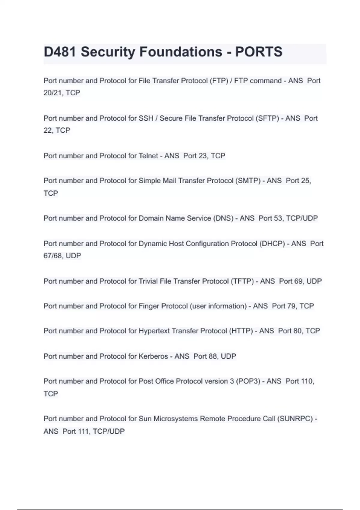 D481 Security Foundations - PORTS Exam Questions And Answers Port number and Protocol for File Transfer Protocol (FTP) / FTP command - ANS Port 20/21, TCP Port number and Protocol for SSH / Secure File Transfer Protocol (SFTP) - ANS Port 22, TCP Port number and Protocol for Telnet - ANS Port 23, TCP Port number and Protocol for Simple Mail Transfer Protocol (SMTP) - ANS Port 25, TCP Port number and Protocol for Domain Name Service (DNS) - ANS Port 53, TCP/UDP Port number and Protocol for Dynamic Host Configuration Protocol (DHCP) - ANS Port 67/68, UDP Port number and Protocol for Trivial File Transfer Protocol (TFTP) - ANS Port 69, UDP Port number and Protocol for Finger Protocol (user information) - ANS Port 79, TCP Port number and Protocol for Hypertext Transfer Protocol (HTTP) - ANS Port 80, TCP Port number and Protocol for Kerberos - ANS Port 88, UDP Port number and Protocol for Post Office Protocol version 3 (POP3) - ANS Port 110, TCP