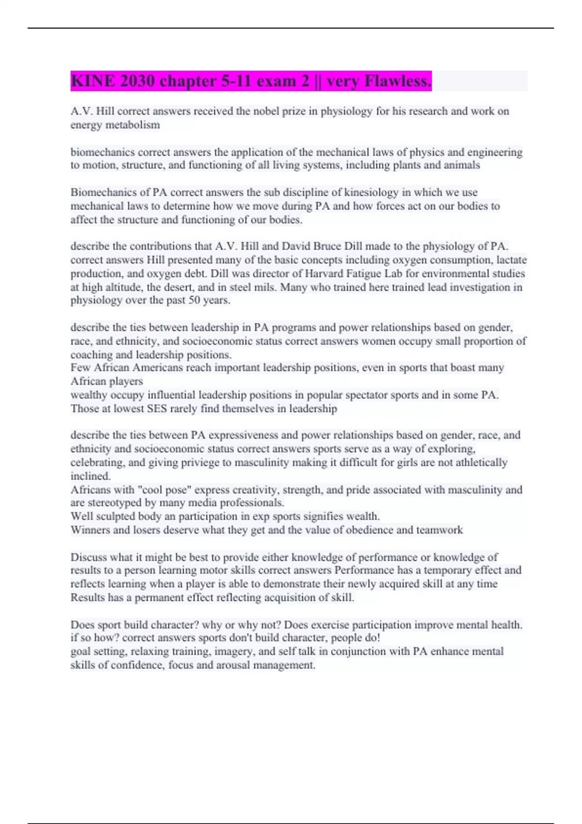 A.V. Hill correct answers received the nobel prize in physiology for his research and work on energy metabolism biomechanics correct answers the application of the mechanical laws of physics and engineering to motion, structure, and functioning of all living systems, including plants and animals Biomechanics of PA correct answers the sub discipline of kinesiology in which we use mechanical laws to determine how we move during PA and how forces act on our bodies to affect the structure and functioning of our bodies. describe the contributions that A.V. Hill and David Bruce Dill made to the physiology of PA. correct answers Hill presented many of the basic concepts including oxygen consumption, lactate production, and oxygen debt. Dill was director of Harvard Fatigue Lab for environmental studies at high altitude, the desert, and in steel mils. Many who trained here trained lead investigation in physiology over the past 50 years. describe the ties between leadership in PA programs and power relationships based on gender, race, and ethnicity, and socioeconomic status correct answers women occupy small proportion of coaching and leadership positions. Few African Americans reach important leadership positions, even in sports that boast many African players wealthy occupy influential leadership positions in popular spectator sports and in some PA. Those at lowest SES rarely find themselves in leadership describe the ties between PA expressiveness and power relationships based on gender, race, and ethnicity and socioeconomic status correct answers sports serve as a way of exploring, celebrating, and giving priviege to masculinity making it difficult for girls are not athletically inclined. Africans with "cool pose" express creativity, strength, and pride associated with masculinity and are stereotyped by many media professionals. Well sculpted body an participation in exp sports signifies wealth. Winners and losers deserve what they get and the value of obedience and teamwork Discuss what it might be best to provide either knowledge of performance or knowledge of results to a person learning motor skills correct answers Performance has a temporary effect and reflects learning when a player is able to demonstrate their newly acquired skill at any time Results has a permanent effect reflecting acquisition of skill. Does sport build character? why or why not? Does exercise participation improve mental health. if so how? correct answers sports don't build character, people do! goal setting, relaxing training, imagery, and self talk in conjunction with PA enhance mental skills of confidence, focus and arousal management.