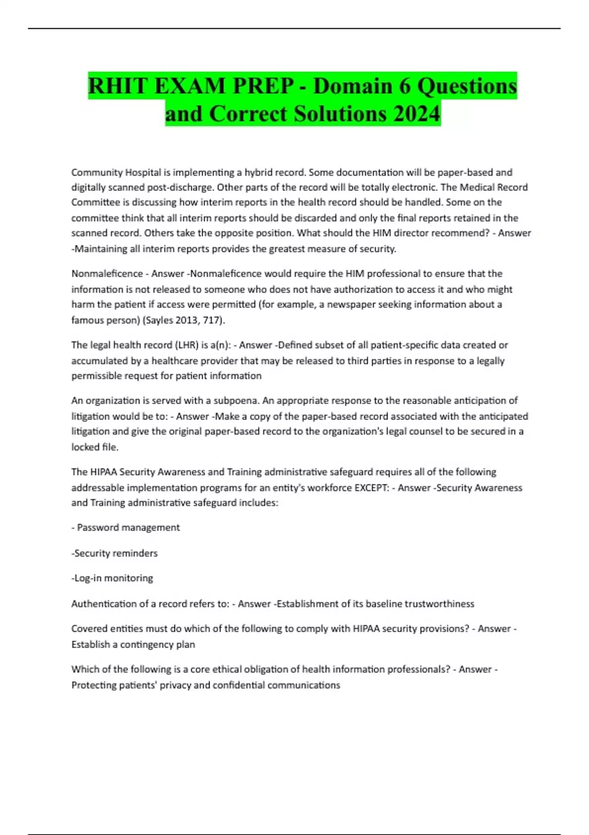 RHIT EXAM PREP - Domain 6 Questions and Correct Solutions 2024 Community Hospital is implementing a hybrid record. Some documentation will be paper-based and digitally scanned post-discharge. Other parts of the record will be totally electronic. The Medical Record Committee is discussing how interim reports in the health record should be handled. Some on the committee think that all interim reports should be discarded and only the final reports retained in the scanned record. Others take the opposite position. What should the HIM director recommend? - Answer -Maintaining all interim reports provides the greatest measure of security