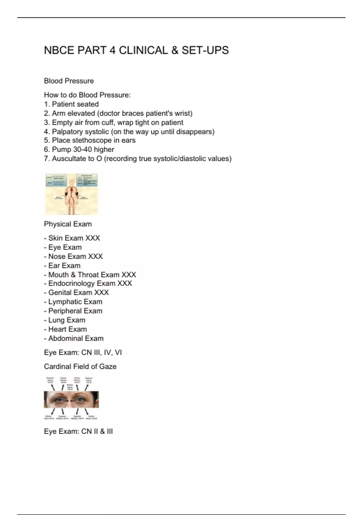 Blood Pressure How to do Blood Pressure: 1. Patient seated 2. Arm elevated (doctor braces patient's wrist) 3. Empty air from cuff, wrap tight on patient 4. Palpatory systolic (on the way up until disappears) 5. Place stethoscope in ears 6. Pump 30-40 higher 7. Auscultate to O (recording true systolic/diastolic values) Physical Exam - Skin Exam XXX - Eye Exam - Nose Exam XXX - Ear Exam - Mouth & Throat Exam XXX - Endocrinology Exam XXX - Genital Exam XXX - Lymphatic Exam - Peripheral Exam - Lung Exam - Heart Exam - Abdominal Exam Eye Exam: CN III, IV, VI Cardinal Field of Gaze Eye