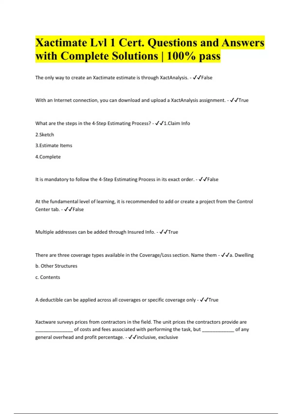 Xactimate Lvl 1 Cert. Questions and Answers with Complete Solutions | 100% pass