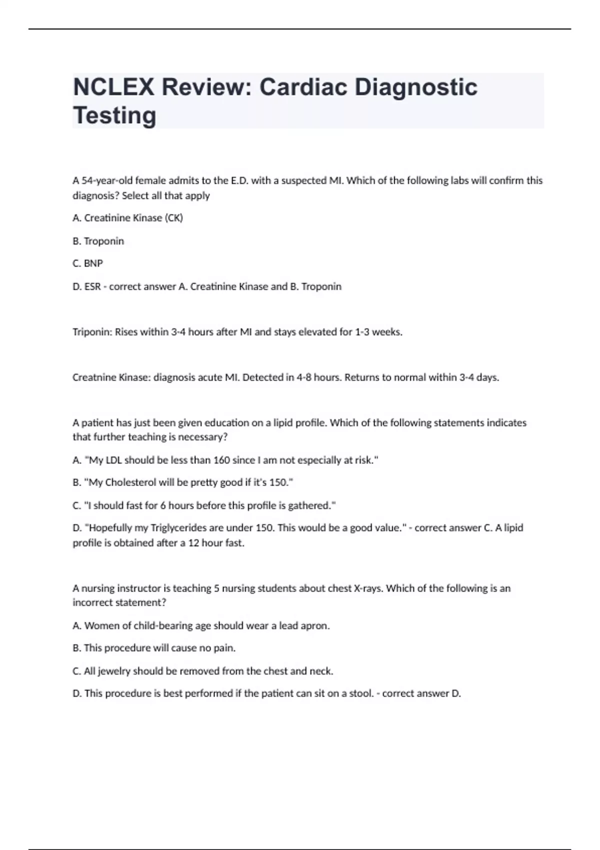 NCLEX Review Cardiac Diagnostic Testing Questions with complete solution NCLEX Review: Cardiac Diagnostic Testing A 54-year-old female admits to the E.D. with a suspected MI. Which of the following labs will confirm this diagnosis? Select all that apply A. Creatinine Kinase (CK) B. Troponin C. BNP D. ESR - correct answer A. Creatinine Kinase and B. Troponin Triponin: Rises within 3-4 hours after MI and stays elevated for 1-3 weeks. Creatnine Kinase: diagnosis acute MI. Detected in 4-8 hours. Returns to normal within 3-4 days. A patient has just been given education on a lipid profile. Which of the following statements indicates that further teaching is necessary? A. "My LDL should be less than 160 since I am not especially at risk." B. "My Cholesterol will be pretty good if it's 150." C. "I should fast for 6 hours before this profile is gathered." D. "Hopefully my Triglycerides are under 150. This would be a good value." - correct answer C. A lipid profile is obtained after a 12 hour fast. A nursing instructor is teaching 5 nursing students about chest X-rays. Which of the following is an incorrect statement? A. Women of child-bearing age should wear a lead apron. B. This procedure will cause no pain. C. All jewelry should be removed from the chest and neck. D. This procedure is best performed if the patient can sit on a stool. - correct answer D.