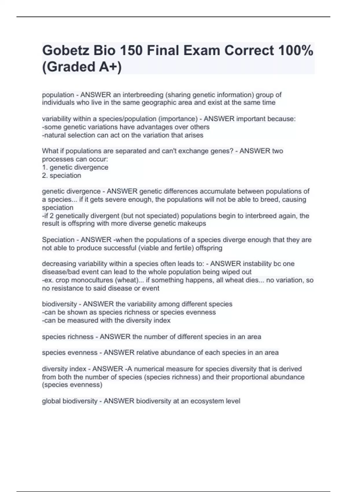 Gobetz Bio 150 Final Exam Correct 100%(Gradpopulation - ANSWER an interbreeding (sharing genetic information) group of individuals who live in the same geographic area and exist at the same time variability within a species/population (importance) - ANSWER important because: -some genetic variations have advantages over others -natural selection can act on the variation that arises What if populations are separated and can't exchange genes? - ANSWER two processes can occur: 1. genetic divergence 2. speciation genetic divergence - ANSWER genetic differences accumulate between populations of a species... if it gets severe enough, the populations will not be able to breed, causing speciation -if 2 genetically divergent (but not speciated) populations begin to interbreed again, the result is offspring with more diverse genetic makeups Speciation - ANSWER -when the populations of a species diverge enough that they are not able to produce successful (viable and fertile) offspring decreasing variability within a species often leads to: - ANSWER instability bc one disease/bad event can lead to the whole population being wiped out -ex. crop monocultures (wheat)... if something happens, all wheat dies... no variation, so no resistance to said disease or event biodiversity - ANSWER the variability among different species -can be shown as species richness or species evenness -can be measured with the diversity index species richness - ANSWER the number of different species in an area species evenness - ANSWER relative abundance of each species in an area diversity index - ANSWER -A numerical measure for species diversity that is derived from both the number of species (species richness) and their proportional abundance (species evenness) ed A+)