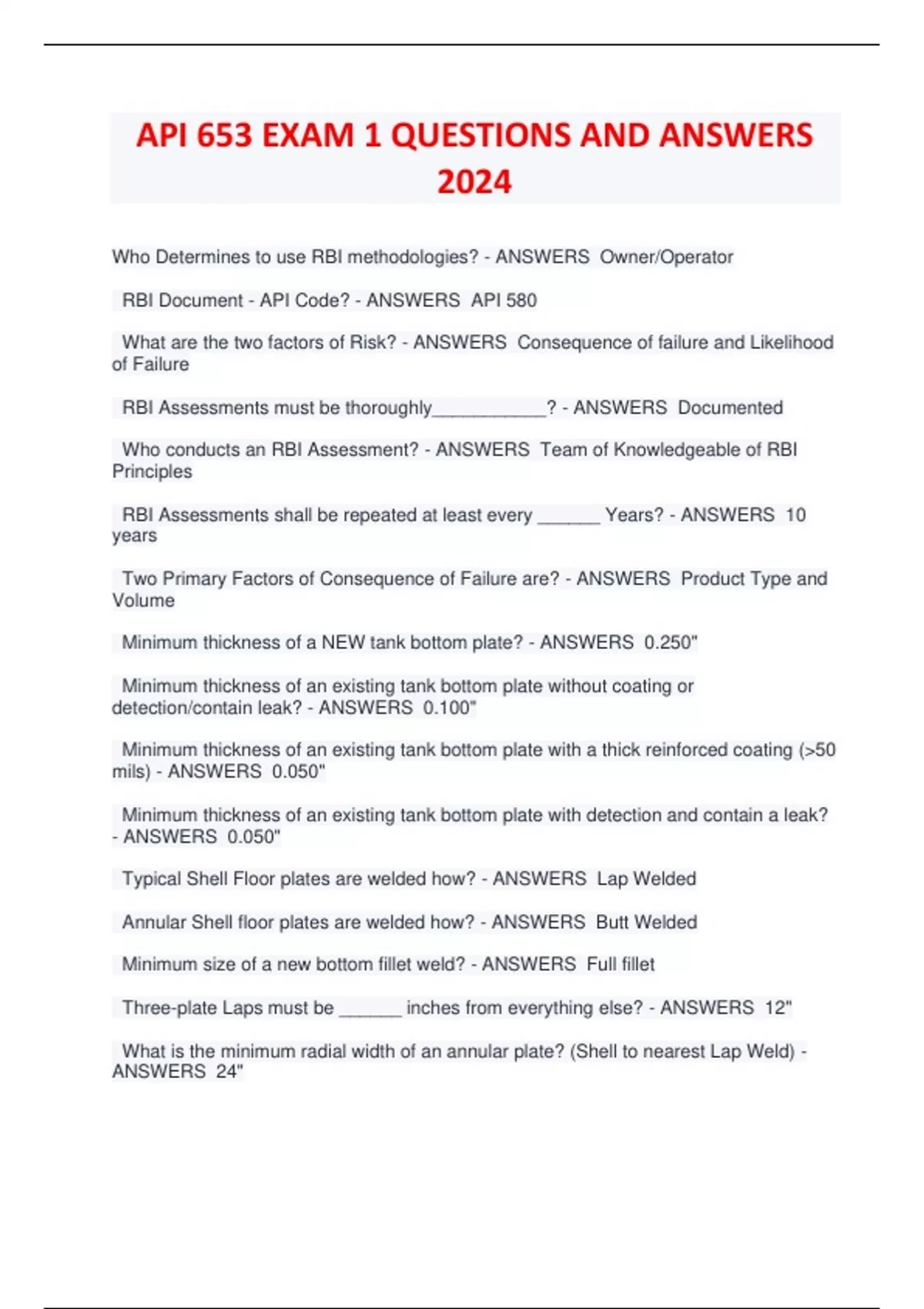 API 653 EXAM 1 QUESTIONS AND ANSWERS 2024 Who Determines to use RBI methodologies? - ANSWERS Owner/Operator RBI Document - API Code? - ANSWERS API 580 What are the two factors of Risk? - ANSWERS Consequence of failure and Likelihood of Failure RBI Assessments must be thoroughly___________? - ANSWERS Documented Who conducts an RBI Assessment? - ANSWERS Team of Knowledgeable of RBI Principles RBI Assessments shall be repeated at least every ______ Years? - ANSWERS 10 years Two Primary Factors of Consequence of Failure are? - ANSWERS Product Type and Volume Minimum thickness of a NEW tank bottom plate? - ANSWERS 0.250" Minimum thickness of an existing tank bottom plate without coating or detection/contain leak? - ANSWERS 0.100" Minimum thickness of an existing tank bottom plate with a thick reinforced coating (50 mils) - ANSWERS 0.050" Minimum thickness of an existing tank bottom plate with detection and contain a leak? - ANSWERS 0.050" Typical Shell Floor plates are welded how? - ANSWERS Lap Welded Annular Shell floor plates are welded how? - ANSWERS Butt Welded Minimum size of a new bottom fillet weld? - ANSWERS Full fillet Three-plate Laps must be ______ inches from everything else? - ANSWERS 12" What is the minimum radial width of an annular plate? (Shell to nearest Lap Weld) - ANSWERS 24" What is the minimum width of a bottom plate extension on outside of shell? (Answer for both New & Existing) - ANSWERS New - 2", Existing - 3/8" What is the minimum thickness allowed of an existing bottom plate extension at the shell-bottom weld? - ANSWERS 0.100" Most existing tank bottoms are inspected with _________. Areas of concern found are normally checked with ____________. - ANSWERS MFL, UT What is the width of the Critical Zone on existing tank bottoms? - ANSWERS 3" What is the minimum thickness of an existing tank bottom in a Critical Zone? - ANSWERS Less of 1/2 of original floor or. 1/2 T-min of 1st Shell Course, Typically it is 0.125" What is the required length of RT on a Vert or Horizontal Tank Weld? - ANSWERS 6" What is the required length of RT at Tank Intersections at: Vertical? Horizontal? - ANSWERS 3" on Verts weld seam and 2" on each side of verts If there is a weld defect in a spot RT, how many RTs are required? - ANSWERS 2 unless there is 3" of good weld beyond the defect. Method for RT: RT is shot to____________? - ANSWERS ASME Section V What requirements are needed for Personnel to shoot an RT on a Tank? - ANSWERS ASNT SNT-TC-1A Acceptance Criteria for RT on a tank is? - ANSWERS ASME Section VIII A rounded indication is one that's length is less than or equal to ___________ times its width - ANSWERS 3 times 100% of new vertical welds should be RT'd if the shell thickness is greater than _______________? - ANSWERS 1" How many RT's are needed when a rectangular insert plate is installed in the shell? - ANSWERS 6 RTs Which RT exposure technique is preferred? - ANSWERS Single Wall What is the minimum # of RTs required for a nozzle/pipe butt weld being completed using a double-wall technique with a single view? - ANSWERS 3 - 120 degrees apart What is the minimum # of RTs required for a nozzle/pipe butt weld being RT'd using a double wall technique with a double-wall view? - ANSWERS 2- 0 degree and 90 degree The maximum pipe size when RT'ing a pipe using docuble-wall technique with a double-wall view is _________? - ANSWERS NPS 3 or 3.5" OD. Wire IQI's are placed on the weld with the wires ____________ to the weld? - ANSWERS Perpendicular Hole Type IQI's are normally placed ___________ to the weld. - ANSWERS Adjacent If a hole-type IQI is used; the ________ hole must be seen in the RT. - ANSWERS 2T hole The preferred location for the IQI is on the ________ side? - ANSWERS Source Side If an IQI is placed on the film side, a lead letter __________ should be placed near the IQI. - ANSWERS F If a shim is used under a hole-type IQI, then ________ side of the IQI should be distinctly visible in the RT? - ANS