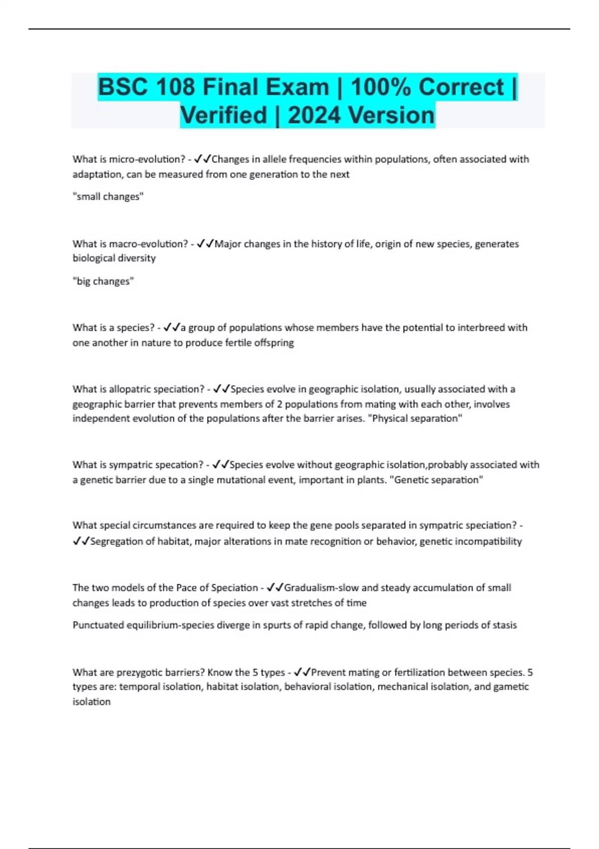 BSC 108 Final Exam | 100% Correct | Verified | 2024 Version What is micro-evolution? - Changes in allele frequencies within populations, often associated with adaptation, can be measured from one generation to the next "small changes" What is macro-evolution? - Major changes in the history of life, origin of new species, generates biological diversity "big changes" What is a species? - a group of populations whose members have the potential to interbreed with one another in nature to produce fertile offspring What is allopatric speciation? - Species evolve in geographic isolation, usually associated with a geographic barrier that prevents members of 2 populations from mating with each other, involves independent evolution of the populations after the barrier arises. "Physical separation" What is sympatric specation? - Species evolve without geographic isolation,probably associated with a genetic barrier due to a single mutational event, important in plants. "Genetic separation" What special circumstances are required to keep the gene pools separated in sympatric speciation? - Segregation of habitat, major alterations in mate recognition or behavior, genetic incompatibility The two models of the Pace of Speciation - Gradualism-slow and steady accumulation of small changes leads to production of species over vast stretches of time Punctuated equilibrium-species diverge in spurts of rapid change, followed by long periods of stasis What are prezygotic barriers? Know the 5 types - Prevent mating or fertilization between species. 5 types are: temporal isolation, habitat isolation, behavioral isolation, mechanical isolation, and gametic isolation Example of temporal isolation - Eastern and Western spotted skunks mate at different times of year, preventing them from producing offspring even in areas where the two species live together Example of habitat isolation - Even though they occupy the same geographic area, these two species of garter snakes occupy different habitats, preventing them from mating Example of behavioral isolation - Blue footed boobies and many other animals use complex courtship displays in selecting mates. Because other species cannot mimic these displays, offspring are not produced with members of other species Example of mechanical isolation - Snails of different species in the genus Bradybaena may attempt to mate, but differences in the shapes of their shells prevent them from succeeding Example of gametic isolation - Although the sperm and eggs of these two sea urchin species are released into the water, they are unable to fuse because the proteins on the surface of the eggs and sperm cannot bind to one another What are postzygotic barriers? Know the 3 types - Prevent survival or reproduction of hybrid offspring. 3 types are hybrid inviability (miscarriage), hybrid sterility (sterile offspring), and hybrid breakdown(1st generation produces sterile/weak 2nd generation) Example of hybrid inviability - Different salamander species sometimes mate, but the offspring fail to complete development, keeping the gene pools of the two species isolated from one another Example of hybrid sterility - Different species may mate, and produce viable offspring that are sterile, preventing further mixing of gene pools. Mules are robust animals, offspring of a donkey and horse, but they cannot reproduce Example of hybrid breakdown (a post-zygotic barrier) - The first generation of hybrids may be both viable and fertile, but due to genetic factors the offspring of these hybrids are weak, feeble, or sterile, as in domesticated rice strains. The 8 classification levels for naming a species - Domain, kingdom, phylum, class, order, family, genus, species The 8 classification levels for human beings - Domain: Eukaryota, Kingdom: Animilia, Phylum: Chordata, Class: Mammalia, Order: Primates, Family: Hominidae, Genus: Homo, Species: sapiens EACMPHHS What is ecology? - the scientific study of the interactions between organisms and their environments What are abiotic factors? Know the 5 examples - The nonliving chemical and physical factors in an environment. 5 examples are water, sunlight, oxygen, temperature, and soil. What are biotic factors? Know some examples - The living factors in an environment What are the four levels of ecology? Know what each is concerned with - Organismal ecology- concerned with evolutionary adaptations that