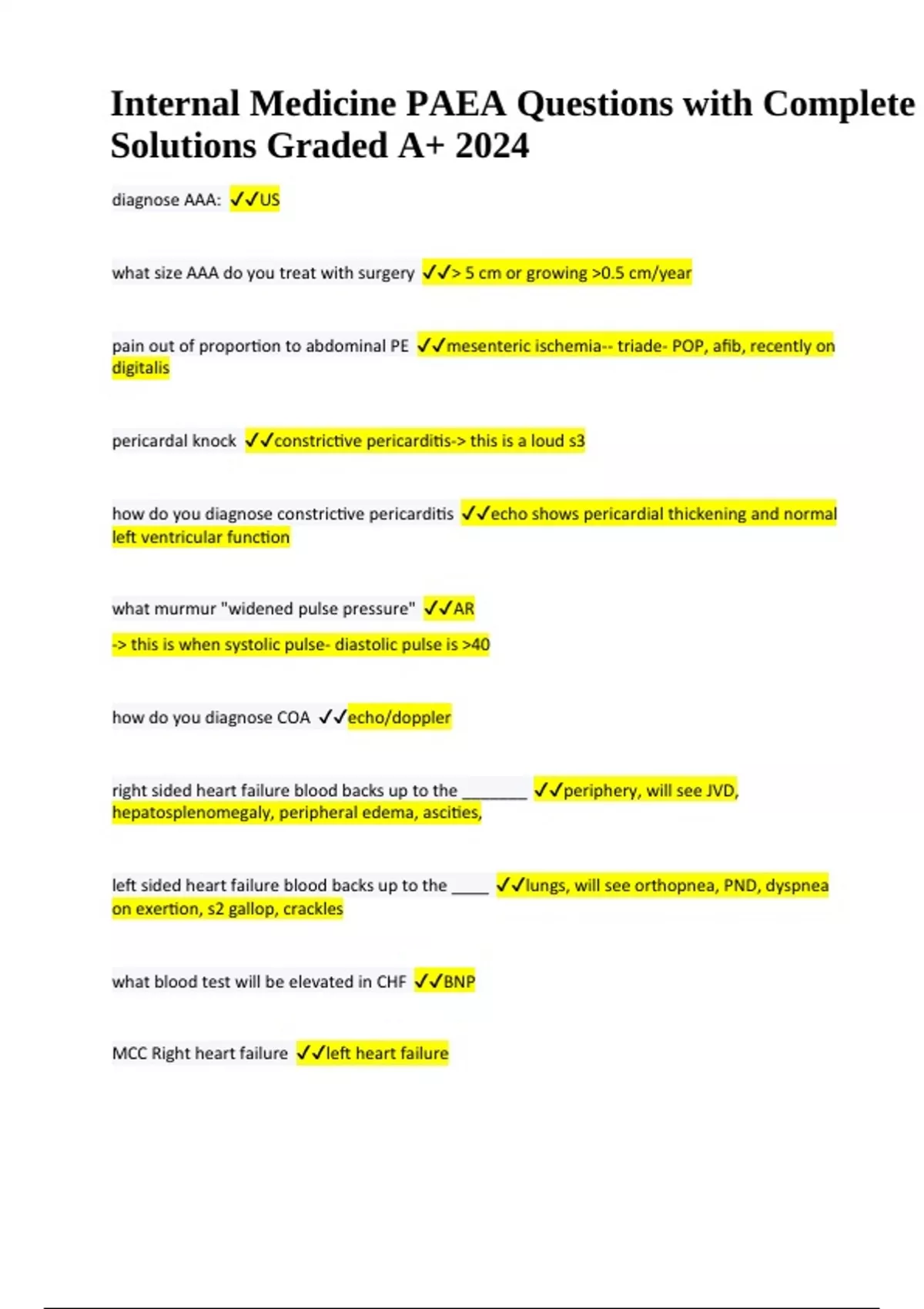 Internal Medicine PAEA Questions with Complete Solutions Graded A+ 2024. diagnose AAA: US what size AAA do you treat with surgery > 5 cm or growing >0.5 cm/year pain out of proportion to abdominal PE mesenteric ischemia-- triade- POP, afib, recently on digitalis pericardal knock constrictive pericarditis-> this is a loud s3 how do you diagnose constrictive pericarditis echo shows pericardial thickening and normal left ventricular function what murmur "widened pulse pressure" AR -> this is when systolic pulse- diastolic pulse is >40 how do you diagnose COA echo/doppler right sided heart failure blood backs up to the _______ periphery, will see JVD, hepatosplenomegaly, peripheral edema, ascities, left sided heart failure blood backs up to the ____ lungs, will see orthopnea, PND, dyspnea on exertion, s2 gallop, crackles what blood test will be elevated in CHF BNP MCC Right heart failure left heart failure Internal Medicine PAEA Questions with Complete Solutions Graded A+ 2024 McC Left heart failure CAD, hypertension, valvular disease endocarditis class I: no limitation class II CHF : slight limitations with exertion class III: marked limitation with exertion class IV: symptomatic at rest SE niacin: hyperglycemia treatment of choice hyperlipidemia: statins (HMG-CoA reductase inhibitors) treatment of htn for diabetic: ACE to protect the kidneys Duke criteria for infective endocarditis: 2 major, 1 major + 3 minor, or 5 minor: major: 1. 2 positive blood cultures taken at least 12 hours apart or 3 + positive cultures atleast 1 hour apart 2. echo vegetations are pathognomonic (TEE more sensitive 3. new regurgitate murmur minor: 1. predisposing lesion on valve or IVDA 2. fever >38 3. oslers nodes(painful), roth spots(retinal hemorrhage), janeway lesions(painless) 4. positive blood cultures 5. echo suspicious for endocarditis in IVDA what valve is typically affected in endocarditis tricuspid -> in a non IVDA the MC valve affected is mitral MCC infective endocarditis strep viridans --> MCC is staph aurues...i thought...strep virdians is for subacute when pt has a murmur or recent dental work... -Lexi loud holosystolic apical murmur radiating to the axilla MR a stress test is considered "positive" for coronary artery disease if which 3 things occur: 1. ECG changes--> 2mm ST depression 2. Hypotension 3. failure to exercise more than 2 minutes due to cardiac symptoms CPK is elevated within ________ in CAD and peaks at ______ elevated within 4-8 hours, peaks at 18-24 hours the extent of elevation of this cardiac serum marker correlates with the amount of cardiac damage CKMB -> so use CKMB to monitor a reinfarction. troponin is elevated within ____ hours but remains for __-__ days 3, 7-10 so this means you cant use it if suspecting a reinfarct bc it will still be high when a pt with suspected MI(STEMI & NSTEMI) comes to the ED we begin: Morphine Oxygen Nitrates ASA BB what are the five P's of occlusive arterial artherosclerosis 1. pain (b/c no blood flow) 2. *pulselessness* 3. *Poikilothermic (cold)* 4. Paresthesias (b/c vascular compromise) 5. pale how do you diagnose occlusive arterial artherosclerosis arteriogram pt presents with pleuritic chest pain on inspiration relieved with leaning forward. 1. what will you expect to hear on auscultation of this patient? 2. what will you see on EKG 3. how do you treat 1. pericardial friction rub 2. global ST elevations and **PR segment depressions*** 3. NSAIDs..colchine for recurrent in peripheral artery disease what color changes will you see in the legs? pale bluish arterial- pale, bluesh, shiny, loss of hair, bad nails what EKG is consistent with bradycardia then tachycardia then bradycardia? what is the definitive treatment? sick sinus syndrome PACEMAKER holosystolic blowing medium-pitched murmur left sternal border 5th ICS, what sign is associated with it? TR Carvallos sign - increased by inspiration post MI, coming in with symptoms of cardiac tamponade . On EKY there are ST elevation in v2- v4. ventricular aneurism,coronary angiography, treat with surgery accessory pathway that allows the electrical signal to travel from sinus node to ventricle bypassing the A-V node. what will you see on EKG? how do you treat?? WPW delta wave (slurring upstroke of QRS) tx:stable: procainamide, amiodarone unstable: synchronized cardioversion *chronic* episodic predicatable pain syndrome due to temporary myocardial ischemia, resolves with rest of medication. what is it and how do you treat? stable angina treat CHRONIC with *BB*..in acute attack give NTG.