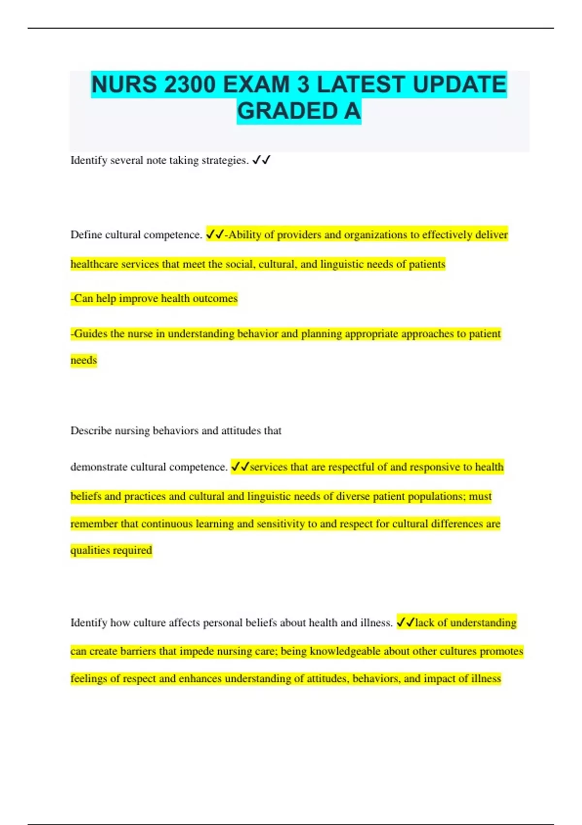 NURS 2300 EXAM 3 LATEST UPDATE GRADED A Identify several note taking strategies. Define cultural competence. -Ability of providers and organizations to effectively deliver healthcare services that meet the social, cultural, and linguistic needs of patients -Can help improve health outcomes -Guides the nurse in understanding behavior and planning appropriate approaches to patient needs Describe nursing behaviors and attitudes that demonstrate cultural competence. services that are respectful of and responsive to health beliefs and practices and cultural and linguistic needs of diverse patient populations; must remember that continuous learning and sensitivity to and respect for cultural differences are qualities required Identify how culture affects personal beliefs about health and illness. lack of understanding can create barriers that impede nursing care; being knowledgeable about other cultures promotes feelings of respect and enhances understanding of attitudes, behaviors, and impact of illness Describe the authority of state boards of nursing to award licenses to practice nursing and discipline nurses Executive- administer the nursing practice act. Legislative- adopt rules necessary to implement the act Judicial- deny, suspend, or revoke a license Authority to set criteria for nursing education programs. Most common reason nurses are disciplined = practicing while under the influence of alcohol or other substance. Explain the elements of malpractice and discuss common reasons nurses are sued for malpractice Malpractice is improper, illegal, or negligent professional activity or treatment Commission - doing something that SHOUDLDN'T have been done Omission- failing to do things that SHOULD have been done Common reasons nurses are sued for malpractice: Failure to follow standards of care Failure to use equipment in a responsible manner Failure to communicate Failure to document Failure to assess and monitor Failure to act as a patient advocate Identify the purposes of HIPAA and implications for practice HIPAA regulations provide data privacy and security provisions for safeguarding medical information and place significant limitations on the content of nurse's social media activities and comments. Violating HIPAA regulations means that the nurse has broken state laws in the process. Identify nursing responsibilities related to delegation, informed consent, and confidentiality Delegation .......giving someone the authority