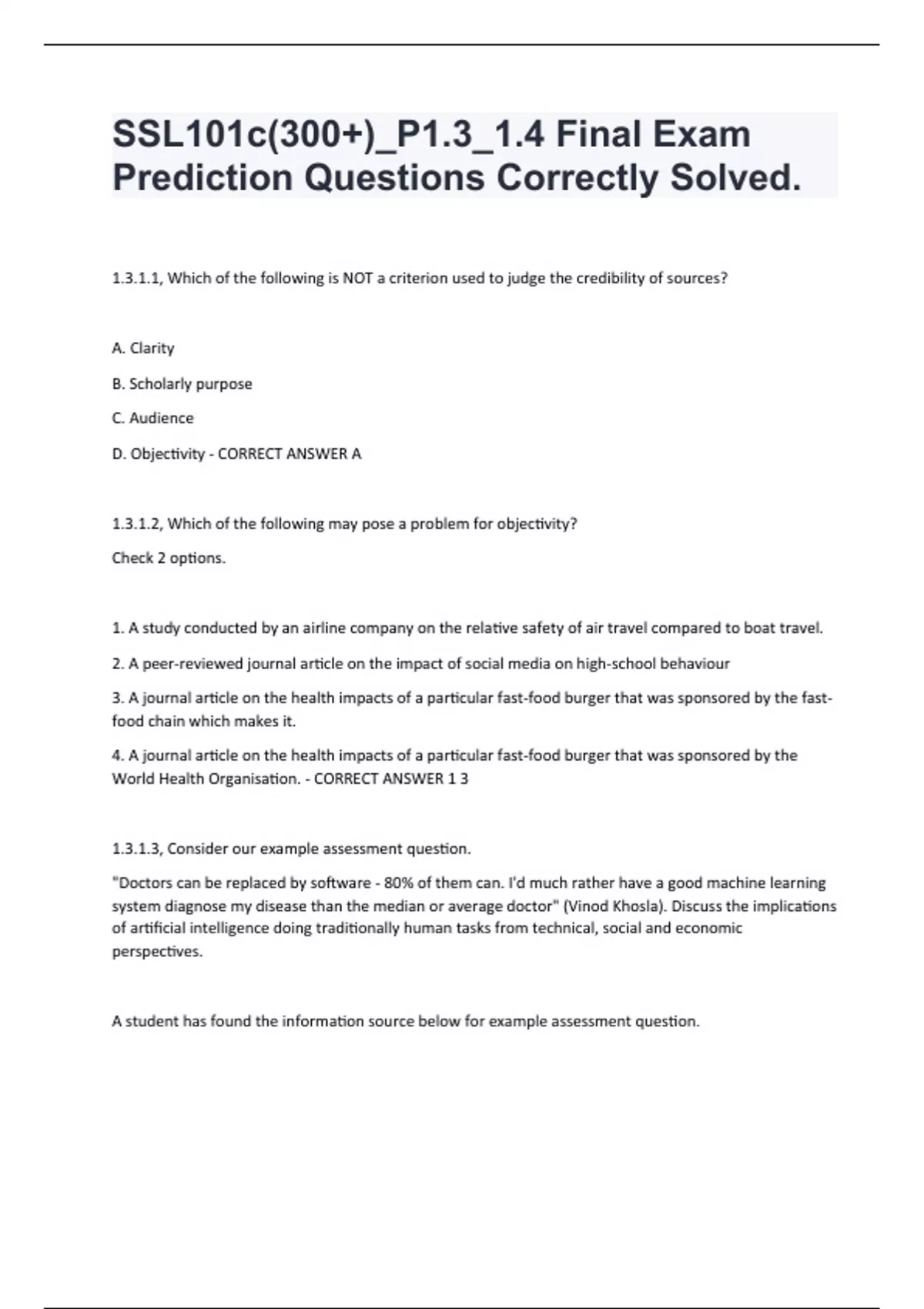 SSL101c(300+)_P1.3_1.4 Final Exam Prediction Questions Correctly Solved. 1.3.1.1, Which of the following is NOT a criterion used to judge the credibility of sources? A. Clarity B. Scholarly purpose C. Audience D. Objectivity - CORRECT ANSWER A 1.3.1.2, Which of the following may pose a problem for objectivity? Check 2 options. 1. A study conducted by an airline company on the relative safety of air travel compared to boat travel. 2. A peer-reviewed journal article on the impact of social media on high-school behaviour 3. A journal article on the health impacts of a particular fast-food burger that was sponsored by the fast-food chain which makes it. 4. A journal article on the health impacts of a particular fast-food burger that was sponsored by the World Health Organisation. - CORRECT ANSWER 1 3 1.3.1.3, Consider our example assessment question. "Doctors can be replaced by software - 80% of them can. I'd much rather have a good machine learning system diagnose my disease than the median or average doctor" (Vinod Khosla). Discuss the implications of artificial intelligence doing traditionally human tasks from technical, social and economic perspectives. A student has found the information source below for example assessment question. An interview in the 'News' section of National Geographic online with the writer of a book on AI and employment. The writer of the book discusses the economic benefits and drawbacks of AI to the economy. The writer of the article is a professional writer. The article was published in 2015. What is the problem with the source's credibility? Check 2 options. 1. The authority 2. The source's audience is not academic. 3. The source lacks accuracy. 4. The source is credible. - CORRECT ANSWER 1 2 1.3.2.1, Consider our example assessment question. "Doctors can be replaced by software - 80% of them can. I'd much rather have a good machine learning system diagnose my disease than the median or average doctor" (Vinod Khosla). Discuss the implications of artificial intelligence doing traditionally human tasks from technical, social and economic perspectives. Which of the following sources would best meet the needs of this assessment? Check 2 options.