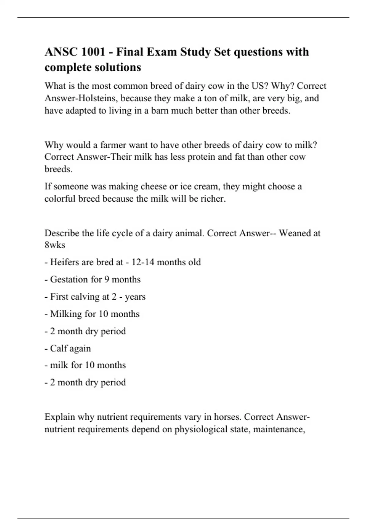 Describe the life cycle of a dairy animal. Correct Answer-- Weaned at