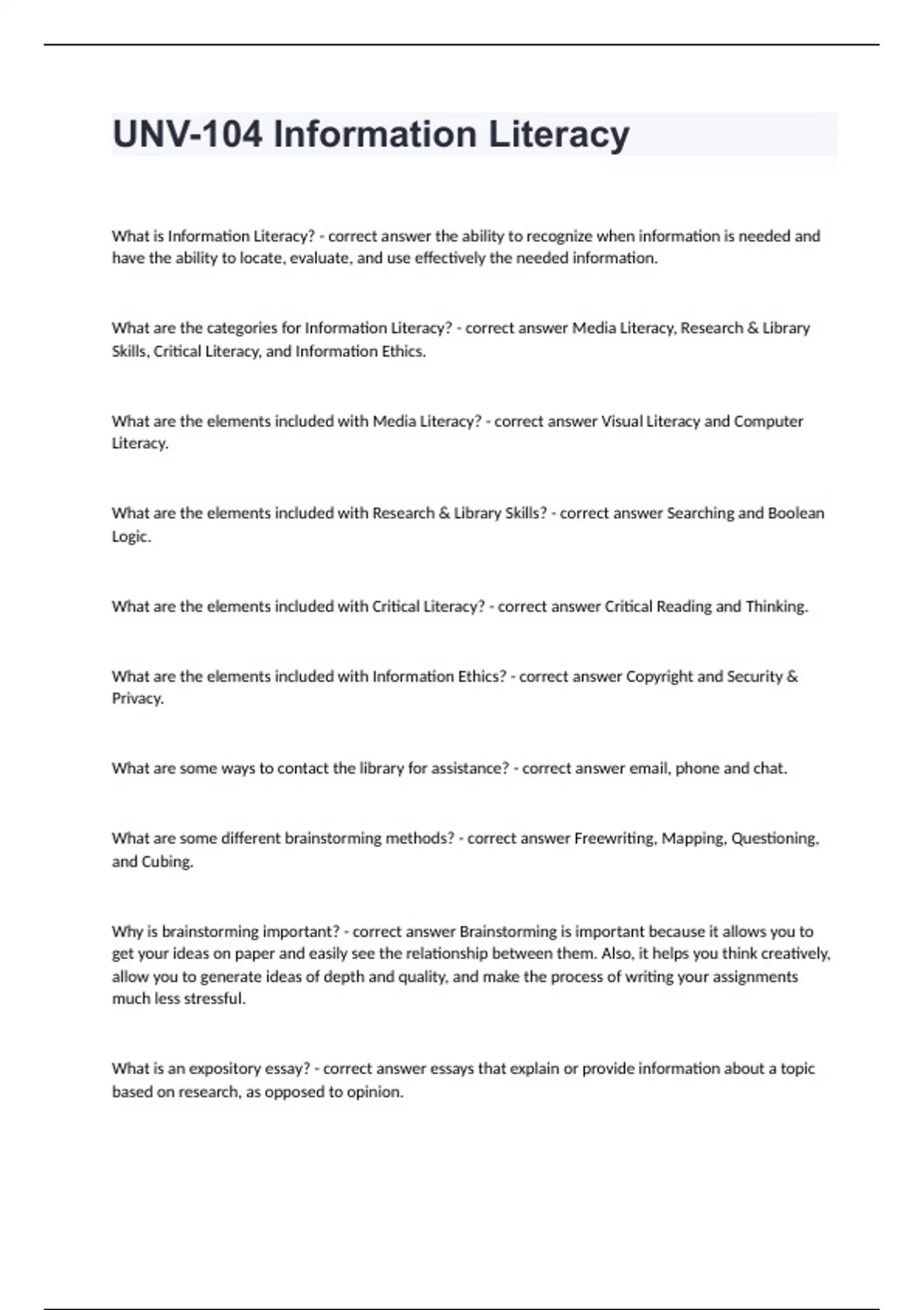 UNV-104 Information Literacy questions and answers rated A+What is Information Literacy? - correct answer the ability to recognize when information is needed and have the ability to locate, evaluate, and use effectively the needed information. What are the categories for Information Literacy? - correct answer Media Literacy, Research & Library Skills, Critical Literacy, and Information Ethics. What are the elements included with Media Literacy? - correct answer Visual Literacy and Computer Literacy. What are the elements included with Research & Library Skills? - correct answer Searching and Boolean Logic. What are the elements included with Critical Literacy? - correct answer Critical Reading and Thinking. What are the elements included with Information Ethics? - correct answer Copyright and Security & Privacy. What are some ways to contact the library for assistance? - correct answer email, phone and chat. What are some different brainstorming methods? - correct answer Freewriting, Mapping, Questioning, and Cubing. Why is brainstorming important? - correct answer Brainstorming is important because it allows you to get your ideas on paper and easily see the relationship between them. Also, it helps you think creatively, allow you to generate ideas of depth and quality, and make the process of writing your assignments much less stressful. What is an expository essay? - correct answer essays that explain or provide information about a topic based on research, as opposed to opinion.