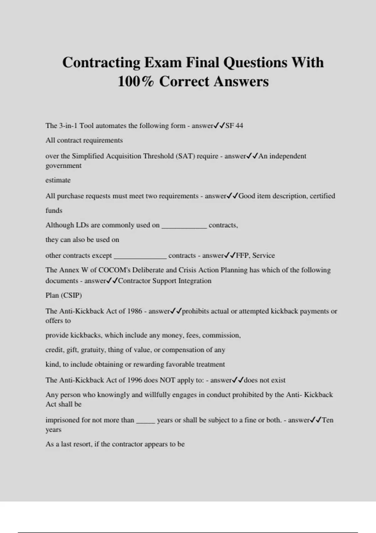 Contracting Exam Final Questions With 100% Correct Answers The 3-in-1 Tool automates the following form - answerSF 44 All contract requirements over the Simplified Acquisition Threshold (SAT) require - answerAn independent government estimate All purchase requests must meet two requirements - answerGood item description, certified funds Although LDs are commonly used on ____________ contracts, they can also be used on other contracts except ______________ contracts - answerFFP, Service The Annex W of COCOM's Deliberate and Crisis Action Planning has which of the following documents - answerContractor Support Integration Plan (CSIP) The Anti-Kickback Act of 1986 - answerprohibits actual or attempted kickback payments or offers to provide kickbacks, which include any money, fees, commission, credit, gift, gratuity, thing of value, or compensation of any kind, to include obtaining or rewarding favorable treatment The Anti-Kickback Act of 1996 does NOT apply to: - answerdoes not exist Any person who knowingly and willfully engages in conduct prohibited by the Anti- Kickback Act shall be imprisoned for not more than _____ years or shall be subject to a fine or both. - answerTen years As a last resort, if the contractor appears to be offended, accept the gratuity and perform which of the following steps? - answer1. Have your finance officer safeguard the gratuity by placing it in a safe and ask for a receipt 2. Consult with the legal office 3.Write a memo for record (MFR) explaining the circumstances/approx value of the item and mention legal advice was obtained As the CCO, if I am offered an "escort" by a local vendor, which of the following should I do? - answerImmediately inform counsel As the CCO, you know that offices order supplies at the end of the month. However, you noticed that a specific office has also been randomly ordering every two weeks. What is your first thought: - answerThis could be an indication of fraud; further investigation is needed At what point must the Bona Fide Need exist - answerAt time of award,not performance 14. AUTHORITIES AND STRUCTURE - answerContracting Authority The Bona Fide Need for supplies exists when - answer-The Government actually will be able to use such item(s) -The funds are presumed to be available The Bona Fide Needs for non-severable services generally apply to the - answerYear in which a contract is executed The Bona Fide Needs for severable services pertains to the - answerPeriod in which the services are performed The Bona Fide Needs rule provides for what - answerFunds are available only to satisfy requirements during period of availability The CCO or the Customer should contact the accounting and finance office for procedures to fund - answera. Medical