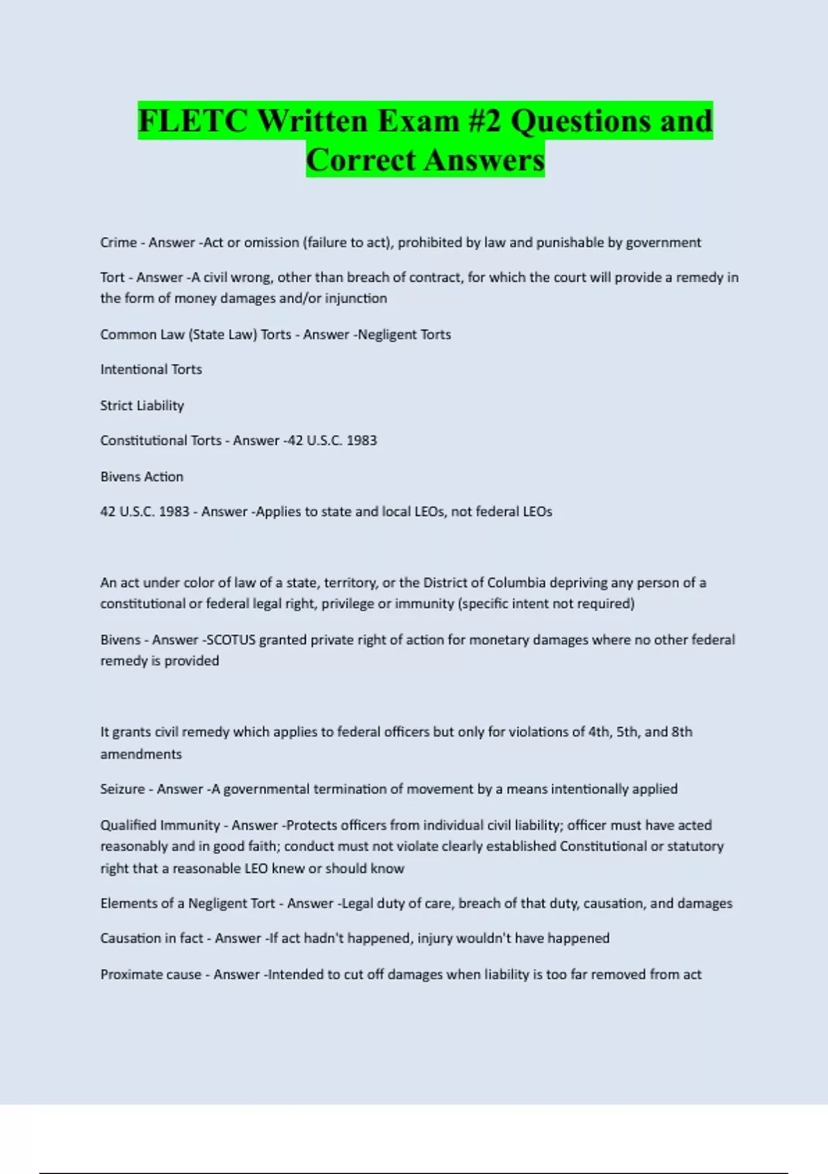 FLETC Written Exam #2 Questions and Correct Answers Crime - Answer -Act or omission (failure to act), prohibited by law and punishable by government Tort - Answer -A civil wrong, other than breach of contract, for which the court will provide a remedy in the form of money damages and/or injunction Common Law (State Law) Torts - Answer -Negligent Torts Intentional Torts Strict Liability Constitutional Torts - Answer -42 U.S.C. 1983 Bivens Action 42 U.S.C. 1983 - Answer -Applies to state and local LEOs, not federal LEOs An act under color of law of a state, territory, or the District of Columbia depriving any person of a constitutional or federal legal right, privilege or immunity (specific intent not required) Bivens - Answer -SCOTUS granted private right of action for monetary damages where no other federal remedy is provided It grants civil remedy which applies to federal officers but only for violations of 4th, 5th, and 8th amendments Seizure - Answer -A governmental termination of movement by a means intentionally applied Qualified Immunity - Answer -Protects officers from individual civil liability; officer must have acted reasonably and in good faith; conduct must not violate clearly established Constitutional or statutory right that a reasonable LEO knew or should know Elements of a Negligent Tort - Answer -Legal duty of care, breach of that duty, causation, and damages Causation in fact - Answer -If act hadn't happened, injury wouldn't have happened Proximate cause - Answer -Intended to cut off damages when liability is