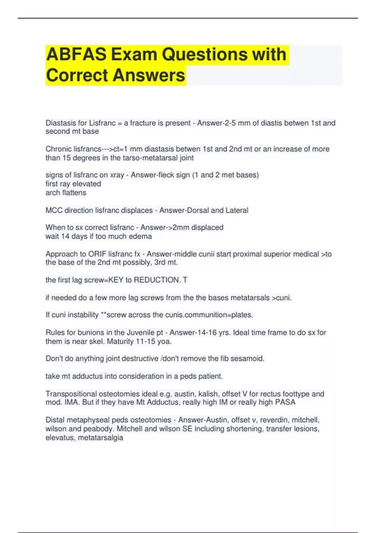 ABFAS Exam Questions with Correct Answers Diastasis for Lisfranc = a fracture is present - Answer-2-5 mm of diastis betwen 1st and second mt base Chronic lisfrancs---ct=1 mm diastasis betwen 1st and 2nd mt or an increase of more than 15 degrees in the tarso-metatarsal joint signs of lisfranc on xray - Answer-fleck sign (1 and 2 met bases) first ray elevated arch flattens MCC direction lisfranc displaces - Answer-Dorsal and Lateral When to sx correct lisfranc - Answer-2mm displaced wait 14 days if too much edema Approach to ORIF lisfranc fx - Answer-middle cunii start proximal superior medical to the base of the 2nd mt possibly, 3rd mt. the first lag screw=KEY to REDUCTION. T if needed do a few more lag screws from the the bases metatarsals cuni. If cuni instability **screw across the nition=plates. Rules for bunions in the Juvenile pt - Answer-14-16 yrs. Ideal time frame to do sx for them is near skel. Maturity 11-15 yoa. Don't do anything joint destructive /don't remove the fib sesamoid. take mt adductus into consideration in a peds patient. Transpositional osteotomies ideal e.g. austin, kalish, offset V for rectus foottype and mod. IMA. But if they have Mt Adductus, really high IM or really high PASA Distal metaphyseal peds osteotomies - Answer-Austin, offset v, reverdin, mitchell, wilson and peabody. Mitchell and wilson SE including shortening, transfer lesions, elevatus, metatarsalgia How to fix bunion in a peds pt with IM 15 - Answer-Base procedure aka proximal metaphyseal osteotomy. -closed or open base wedge, cresentic procedure, lapidus =goal to make first and 2nd mt parallel without damaging the open physeal plate. base of proximal phalanx (aka proximal akin) of hallux what does it correct - Answer- Distal Angle DASA Fix pasa with mt head osteotomy like REVERDIN=lat cortex intact proximal cut parallel to 1st mt and distal cut parallel to articular surface Fix DASA W/ proximal akin disadvantage of the fusion vs plasty is the - Answer-fusion has less hallux propulsion and it can shorten which can then lead to contracture of the ehl or fhl You can walk it immediately vs plasty you cant cancellous vs cortical screws - Answer-Cannulated cancellous screws are used for metaphyseal fractures while cannulated and noncannulated cortical screws are used as lag screws for fixation of diaphyseal fractures. The main advantage of cannulated screws is that they can be inserted over a guide wire or guide pin. The diameter of the guide pin is much smaller than the cannulated screw Cannulated screws have a hollow central shaft. Both cortical and cancellous screws can be cannulated. 1st MPJ arthrodesis position - Answer-neutral rotation of the hallux, 10-15 degrees of valgus 20-30 degrees of dorsiflexion in reference to the axis of the first metatarsal Which does not affect bone healing: 1. Nutritional status, Rheumatoid or methotrexate patient, DM, tobacco hx, extent of initial injury, osteoporosis, other metabolic diseases, neuropathy - Answer-all do mcc for ex fix - Answer-1. m/c complications involve bone healing and not infection others: 1. delayed, nonunion, implant loosening, fracture, chronic pain, soft tissue inflammation, ulceration, or gross infection including osteomyelitis blood supply to talus - Arior tibial artery, artery of the tarsal canal dorsalis pedis artery, perforating peroneal artery. MCC of talar AVN - Answer-post-traumatic talar fracture Pain, swelling, with a history of previous injury or trauma. May have mechanical symptoms such as clicking, locking, or grinding. - Answer-AVN diagnose by a. Plain XR and MRI remain the most used and beneficial modalities. Classification of AVN - Answer-i. Hawkins type I fractures are non displaced vertical neck fractures. AVN is 10%. ii. Hawkins type II fractures consist of a vertical talar neck fracture with either subluxation or displacement of the STJ. AVN is 42%. iii. Hawkins type 3 fractures are characterized by a vertical talar neck fracture with subluxation or dislocation of both the ankle and STJs. AVN 91%. iv. Hawkins type IV fractures vertical talar neck fracture with subluxation or dislocation of the ankle, STJ, and the TNJ. AVN of 100%. what is Hawkins sign - Answer-AVN=Hawkins sign: subchondral radiolucent line along the superior aspect of the talar dome, which classically begins on the medial side of the talar dome, and appears 6-8 weeks after injury. indicative of talar revascularization; seen on AP or mortise view. MRI presentation of AVN - Answer-i. MRI is the most widely used modality to dx and potentially prevent further talar damage due to AVN. a. Normal T1 images will show a strong SI due to bone marrow elements in trabecular bone. b. In early AVN, diffuse marrow edema produces low signal intensity on T1 images and high SI on T2. c. In advanced stages, the diagnosis of AVN on MRI includes decreased SI on both T1 and T2 weighted images indicative of areas of devascularization or necrotic bone. Why perform arthroscopy for AVN - Answer-a. Arthroscopic Debridement and Core Decompression: i. Rationale: Thought to enhance revascularization and decrease intraosseous pressure. 1. Indicated in treatment of F&A stages I and II (partial AVN and those without collapse). ii. Technique: Standard AM and AL portals used for arthroscopy with a lateral sinus tarsi (lateral process) approach for retrograde drilling. post op avn sx - Answer-Posterior splint until sutures removed followed by NWB cast for 4 weeks. 1. 5-6 weeks PO, patient placed into a patellar tendon WB boot walker or brace but still kept strictly NWB (NWB ROM exercises started). 2. 8 weeks PO, XR are taken and the integrity of the talus is judged, PWB allowed on the PTB boot and as healing continues WB is progressed. Patient is then in rigid AFO for the first 6 months. types of Bone Grafts for Talar AVN - Answer-1. Nonvascularized cancellous autograft can be taken from the iliac crest, calcaneus, or femoral head. Useful only in small, contained defects since this does not