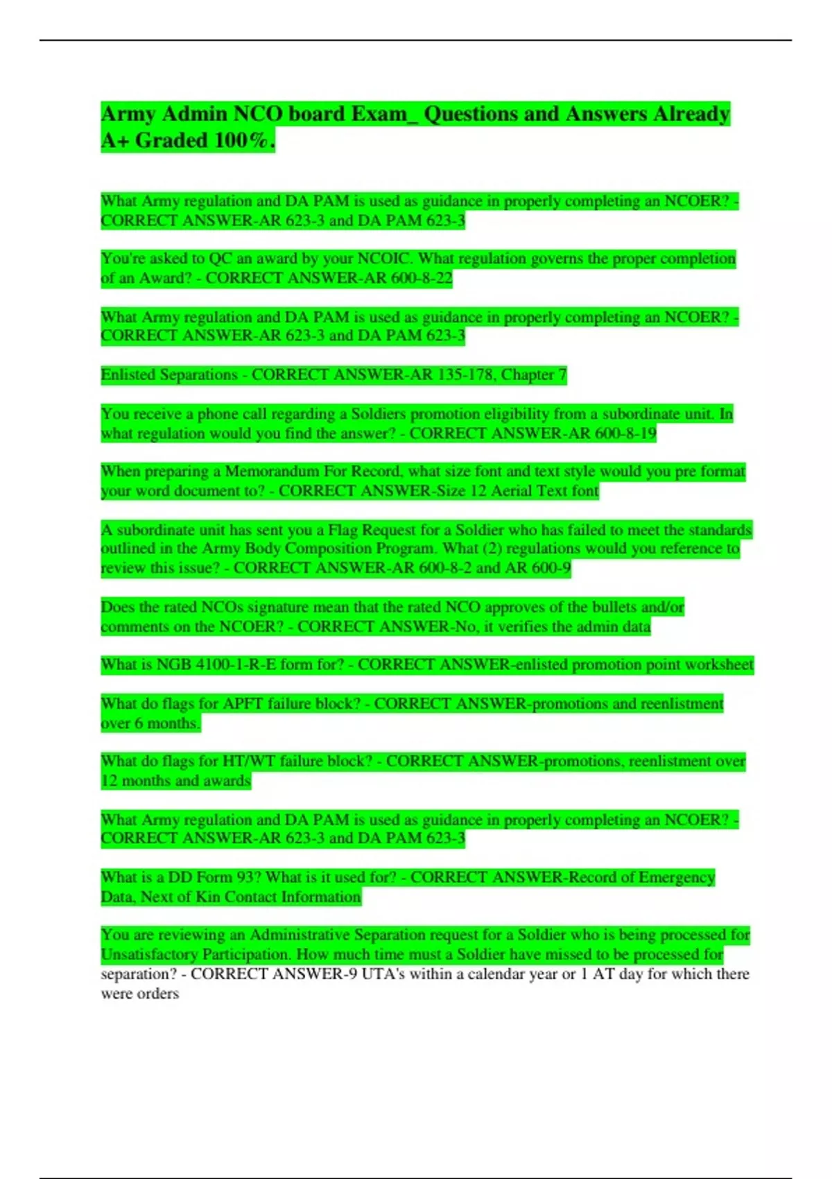Army Admin NCO board Exam_ Questions and Answers Already A+ Graded 100%. What Army regulation and DA PAM is used as guidance in properly completing an NCOER? - CORRECT ANSWER-AR 623-3 and DA PAM 623-3 You're asked to QC an award by your NCOIC. What regulation governs the proper completion of an Award? - CORRECT ANSWER-AR 600-8-22 What Army regulation and DA PAM is used as guidance in properly completing an NCOER? - CORRECT ANSWER-AR 623-3 and DA PAM 623-3 Enlisted Separations - CORRECT ANSWER-AR 135-178, Chapter 7 You receive a phone call regarding a Soldiers promotion eligibility from a subordinate unit. In what regulation would you find the answer? - CORRECT ANSWER-AR 600-8-19 When preparing a Memorandum For Record, what size font and text style would you pre format your word document to? - CORRECT ANSWER-Size 12 Aerial Text font A subordinate unit has sent you a Flag Request for a Soldier who has failed to meet the standards outlined in the Army Body Composition Program. What (2) regulations would you reference to review this issue? - CORRECT ANSWER-AR 600-8-2 and AR 600-9 Does the rated NCOs signature mean that the rated NCO approves of the bullets and/or comments on the NCOER? - CORRECT ANSWER-No, it verifies the admin data What is NGB 4100-1-R-E form for? - CORRECT ANSWER-enlisted promotion point worksheet What do flags for APFT failure block? - CORRECT ANSWER-promotions and reenlistment over 6 months. What do flags for HT/WT failure block? - CORRECT ANSWER-promotions, reenlistment over 12 months and awards What Army regulation and DA PAM is used as guidance in properly completing an NCOER? - CORRECT ANSWER-AR 623-3 and DA PAM 623-3 What is a DD Form 93? What is it used for? - CORRECT ANSWER-Record of Emergency Data, Next of Kin Contact Information You are reviewing an Administrative Separation request for a Soldier who is being processed for Unsatisfactory Participation. How much time must a Soldier have missed to be processed for separation? - CORRECT ANSWER-9 UTA's within a calendar year or 1 AT day for which there were orders What form and supporting documents get submitted in order to update a Soldiers record pertaining to dependents? - CORRECT ANSWER-DA 5960, Birth Certificates, Marriage license
