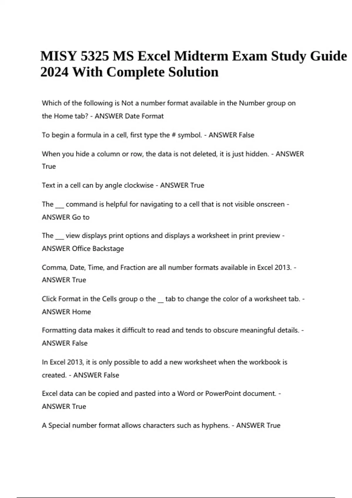 MISY 5325 MS Excel Midterm Exam Study Guide 2024 With Complete Solution.