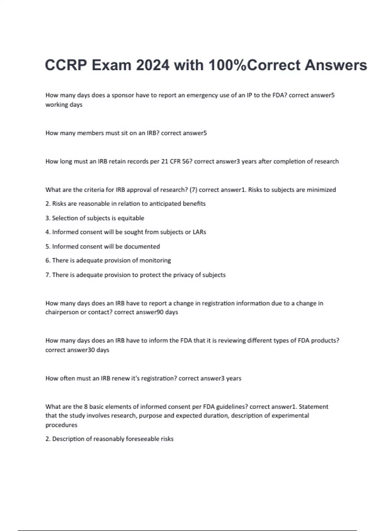 CCRP Exam 2024 with 100%Correct Answers. How many days does a sponsor have to report an emergency use of an IP to the FDA? correct answer5 working days How many members must sit on an IRB? correct answer5 How long must an IRB retain records per 21 CFR 56? correct answer3 years after completion of research What are the criteria for IRB approval of research? (7) correct answer1. Risks to subjects are minimized 2. Risks are reasonable in relation to anticipated benefits 3. Selection of subjects is equitable 4. Informed consent will be sought from subjects or LARs 5. Informed consent will be documented 6. There is adequate provision of monitoring 7. There is adequate provision to protect the privacy of subjects How many days does an IRB have to report a change in registration information due to a change in chairperson or contact? correct answer90 days How many days does an IRB have to inform the FDA that it is reviewing different types of FDA products? correct answer30 days How often must an IRB renew it's registration? correct answer3 years What are the 8 basic elements of informed consent per FDA guidelines? correct answer1. Statement that the study involves research, purpose and expected duration, description of experimental procedures 2. Description of reasonably foreseeable risks 3. Benefits 4. Disclosure of alternative procedures or courses of treatment 5. Confidentiality measures 6. Compensation and treatments available if injury occurs 7. contact information 8. Participation is voluntary and subject may discontinue at any time What are the criteria for involving children in minimal risk research? (2) correct answer1. No greater than minimal risk 2. Assent from kid + consent from parent obtained What are the criteria for involving children in greater than minimal risk research with prospect of benefit? (3) correct answer1. Risks are justified by benefits 2. Relation of anticipated benefit is at least as favorable as that presented by alternative approaches 3. Assent + consent What are the criteria for involving children in greater than minimal risk research with no direct benefit? (4) correct answer1. Risks are minor increase over minimal risk 2. Intervention presents experiences that are reasonable commensurate with normal medical and living situations 3. Intervention is likely to yield generalizable knowledge that is vital 4. Assent + consent Sponsors must report SAEs to the FDA within how many days of discovering the event? correct answer15 calendar days (21 CFR 312.32) Investigators must report SAEs to a sponsor within how many days of discovering the event? correct answerImmediately (21 CFR 312.64) Sponsors must report what kind of serious events to the FDA within 15 calendar days? (4) correct answer1) Serious and unexpected suspected adverse reactions 2) Findings from other studies that suggest a significant risk in humans 3) Findings from animal or in-vitro testing that suggest risks to humans 4) Increased rate of occurrence of serious suspected adverse reactions Sponsors must submit Unanticipated Adverse Device Effects to the FDA within how many days? correct answer10 working days (21 CFR 812.15) Investigators must submit Unanticipated Adverse Device Effects to the FDA within how many days? correct answer10 working days (21 CFR 812.15) When was the Nuremberg Code issued? correct answer1947 What are the 10 points made in the Nuremberg Code? correct answer1) Voluntary informed consent should be obtained 2) Research should yield benefit to society 3) Research should be based on animal work 4) Avoid unnecessary suffering 5) Don't do research resulting in death or disabling injury 6) Risks should be justified by benefits 7) Proper prep and adequate facilities should be used 8) Conducted by scientifically qualified people 9) Subject can withdraw whenever 10) Researchers can end the study if risks are too great When was the Declaration of Helsinki released? correct answer1964.