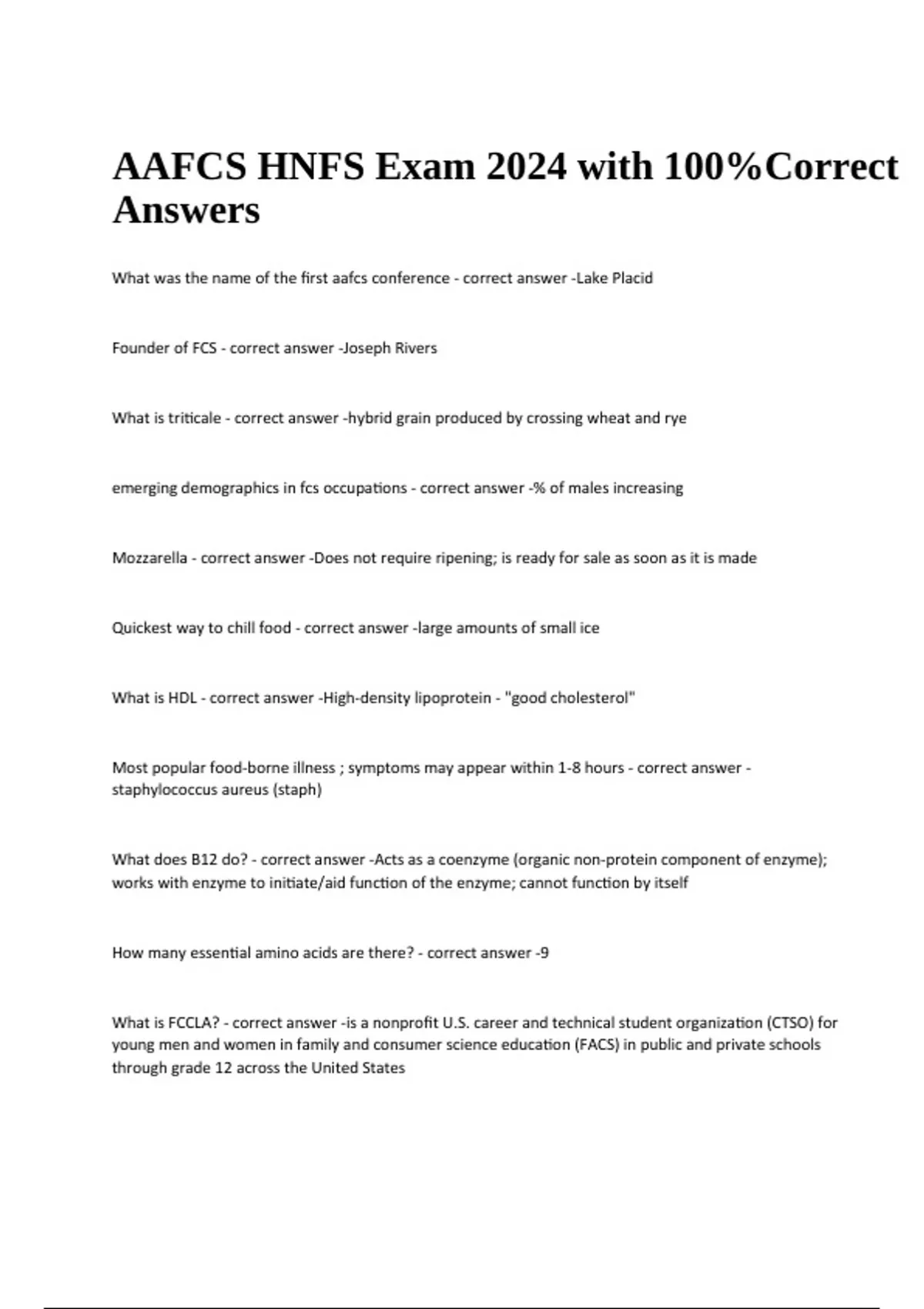 AAFCS HNFS Exam 2024 with 100%Correct Answers. What was the name of the first aafcs conference - correct answer -Lake Placid Founder of FCS - correct answer -Joseph Rivers What is triticale - correct answer -hybrid grain produced by crossing wheat and rye emerging demographics in fcs occupations - correct answer -% of males increasing Mozzarella - correct answer -Does not require ripening; is ready for sale as soon as it is made Quickest way to chill food - correct answer -large amounts of small ice What is HDL - correct answer -High-density lipoprotein - "good cholesterol" Most popular food-borne illness ; symptoms may appear within 1-8 hours - correct answer - staphylococcus aureus (staph) What does B12 do? - correct answer -Acts as a coenzyme (organic non-protein component of enzyme); works with enzyme to initiate/aid function of the enzyme; cannot function by itself How many essential amino acids are there? - correct answer -9 What is FCCLA? - correct answer -is a nonprofit U.S. career and technical student organization (CTSO) for young men and women in family and consumer science education (FACS) in public and private schools through grade 12 across the United States.