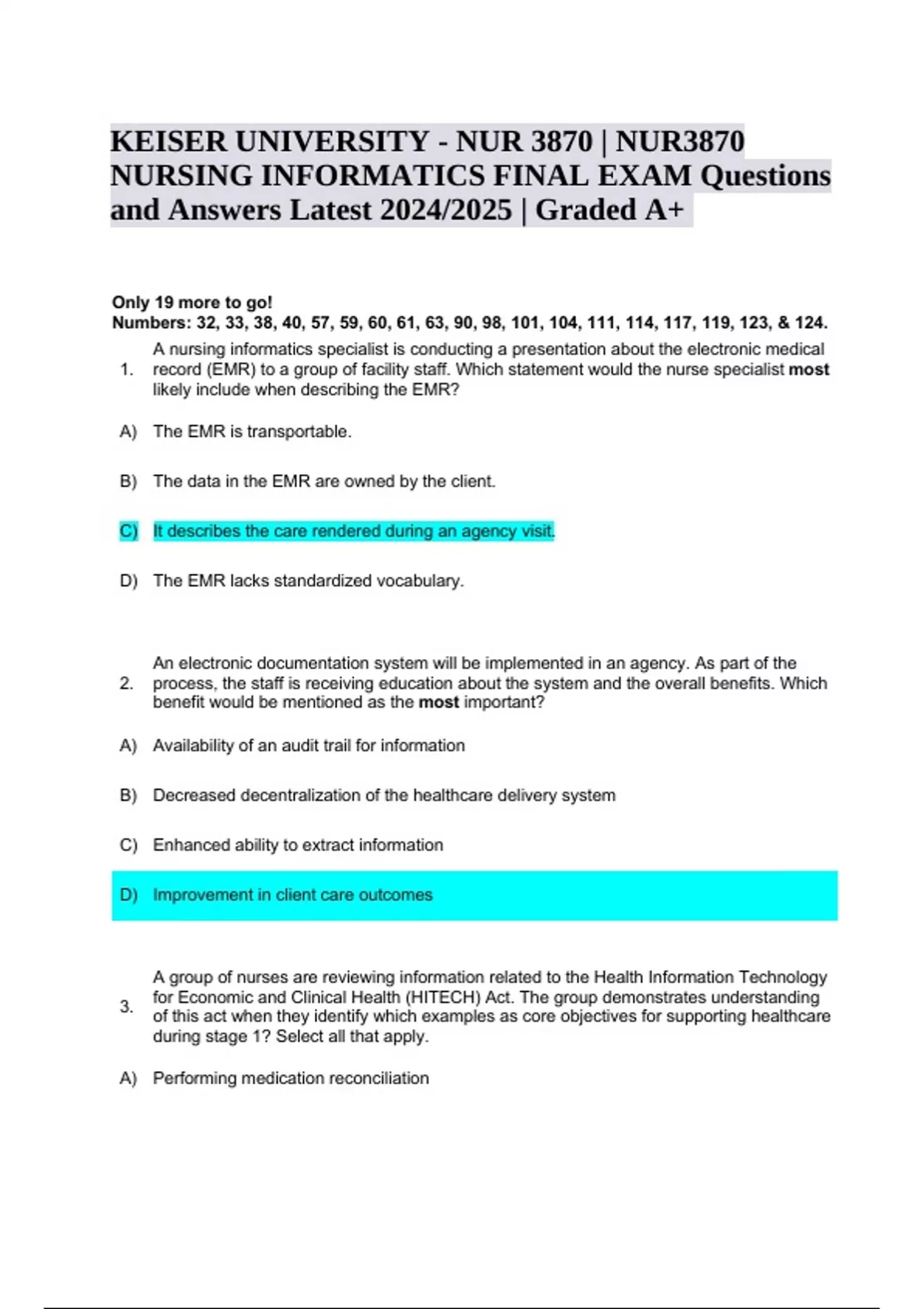 NUR 3870 | NUR3870 NURSING INFORMATICS FINAL EXAM Questions and Answers Latest 2024/2025 (Graded A+) A nursing informatics specialist is conducting a presentation about the electronic medical record (EMR) to a group of facility staff. Which statement would the nurse specialist most likely include when describing the EMR? A) The EMR is transportable. B) The data in the EMR are owned by the client. C) It describes the care rendered during an agency visit. D) The EMR lacks standardized vocabulary. 2. An electronic documentation system will be implemented in an agency. As part of the process, the staff is receiving education about the system and the overall benefits. Which benefit would be mentioned as the most important? A) Availability of an audit trail for information B) Decreased decentralization of the healthcare delivery system C) Enhanced ability to extract information D) Improvement in client care outcomes 3. A group of nurses are reviewing information related to the Health Information Technology for Economic and Clinical Health (HITECH) Act. The group demonstrates understanding of this act when they identify which examples as core objectives for supporting healthcare during stage 1? Select all that apply. A) Performing medication reconciliation KEISER UNIVERSITY - NUR 3870 | NUR3870 NURSING INFORMATICS FINAL EXAM Questions and Answers Latest 2024/2025 | Graded A+ B) Including clinical lab test results in the EHR C) Using computerized provider order entry D) Using a clinical decision support rule E) Sending secure client reminders for follow-up care 4. A nurse is preparing a presentation to a group of staff members comparing paper and electronic documentation. Which weaknesses of paper records would the nurse include? Select all that apply. A) Legibility B) Lack of a backup system C) Difficult to transport D) Slowness in charting E) Easily damaged 5. A nurse is reviewing a client's electronic health record. Based on the nurse's understanding of data standards, which would the nurse identify as defining what data are shared? A) Clinical Document Architecture B) Continuity of Care Document C) Health information system D) Electronic medical record 6. A nurse is reading a journal article about electronic health records and how they can fill in the gaps between evidence and practice. Which benefits would the nurse most likely read about? Select all that apply. A) Monitoring quality improvement outcomes B) Encouraging client partnering with the healthcare provider C) Providing information about controlled clinical trials D) Identifying information that can affect clinical outcomes E) Allowing implementation after extensive long-term knowledge discovery 7. A group of nurses are involved in a lively debate about the strengths and weakness of paper documentation. Which statements would the group use to defend the position for using paper documentation? Select all that apply. A) "Paper records are easily transported." B) "Paper records are much more complete." C) "Paper records are quick to retrieve." D) "Paper records are permanent." E) "Paper records from past stays are easy to obtain." 8. A nursing informatics specialist has been asked to prepare a presentation for a group of staff nurses about an electronic documentation system that is being implemented in the facility. Which features would the nurse specialist include as promoting continuity of care? Select all that apply. A) Ability to have real-time documentation B) Inclusion of an audit trail about detailed record access C) Use of decision support systems and alerts D) Ability to obtain trends about practice E) Ability for instant communication among providers 9. When describing meaningful use, which statement would be most appropriate to include? A) Use of information from EHRs to improve healthcare delivery B) A way to provide a picture of a client's health information C) A means for providing a common structure for clinical documents D) Use of an audit trail to identify information about record access 10. Which component is associated with HIPAA law? Select all that apply. A) Outcomes B) Privacy C) Client engagement D) Security E) Care coordination 11. A new graduate nurse is working at a facility that uses electronic documentation. The nurse has questions about the policies and procedures related to data security. The nurse would identify which person as being responsible for the policies and procedures related to data security? A) Nurse manager B) Nursing informatics specialist C) Client's primary care provider D) HIPAA security officer 12. A nurse is working on a committee that is involved with electronic documentation. The committee is currently working on stage 1. On which action would the committee be focusing? A) Advanced clinical processes B) Data analysis for improved care C) Data capturing and sharing D) Improve outcomes 13. While working as a member of a group tasked with addressing meaningful use with electronic data, the group has met the criteria for stage 1 and is now moving onto stage 2. Which action would now become a focus for the group? A) Recording smoking status for those 13 years of age and older B) Submitting electronic data to immunization registries C) Transmitting prescriptions electronically D) Maintaining an up-to-date diagnosis list 14. As part of the facility orientation, a nursing informatics specialist is describing the different types of client records to a group of newly hired nurses. Which facts would the nurse specialist include when describing electronic medical records (EMRs)? Select all that apply. A) The client owns the data. B) It is an electronic version of the traditional record. C) The EMR is transportable. D) It provides a connection between the EHR and ePHR. E) A client can have many EMRs. 15. After reviewing information about the benefits of electronic health records, a nurse demonstrates understanding of the information by identifying which as one of the most important benefits? A) Con