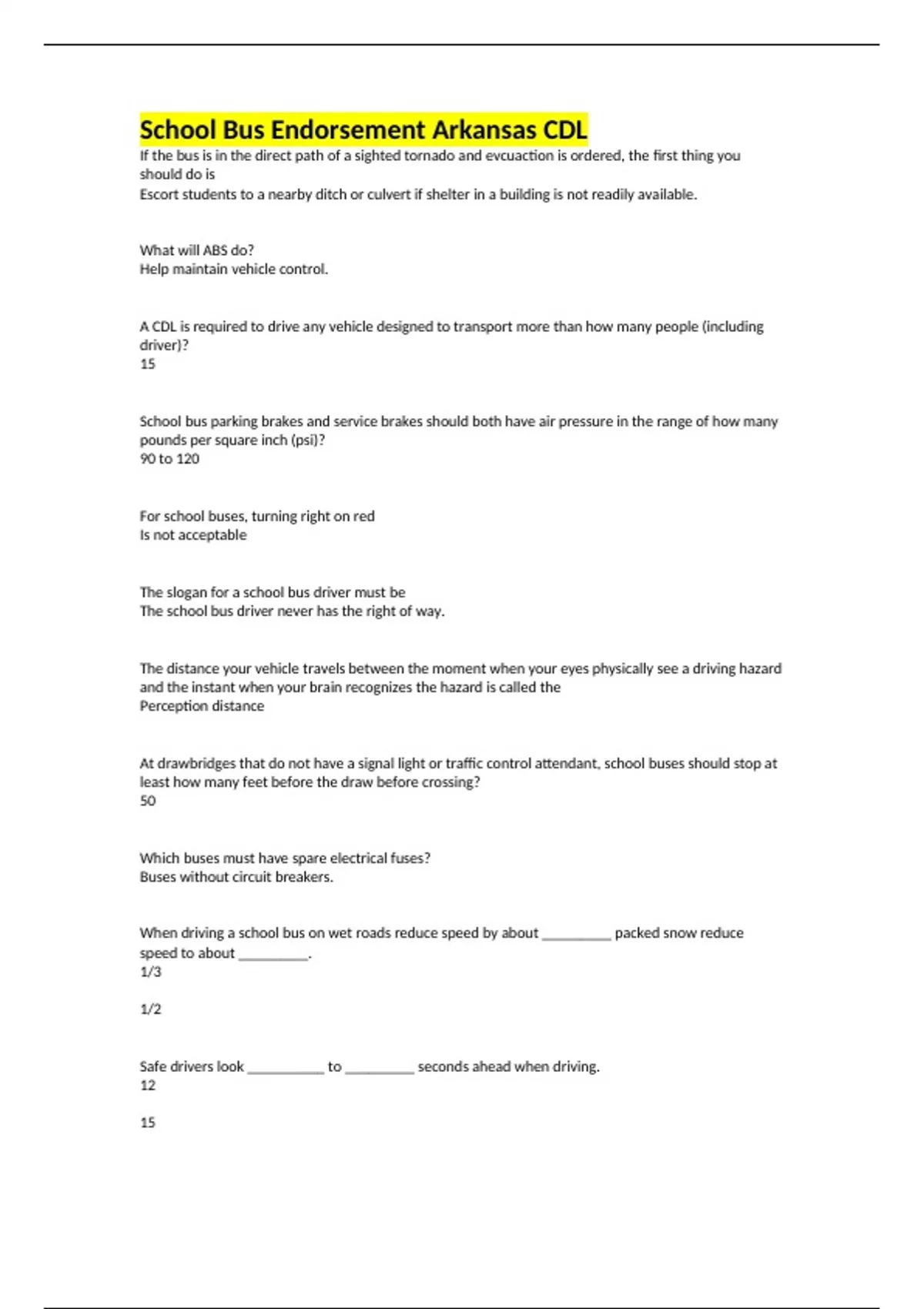 School Bus Endorsement Arkansas CDL If the bus is in the direct path of a sighted tornado and evcuaction is ordered, the first thing you should do is Escort students to a nearby ditch or culvert if shelter in a building is not readily available. What will ABS do? Help maintain vehicle control. A CDL is required to drive any vehicle designed to transport more than how many people (including driver)? 15 School bus parking brakes and service brakes should both have air pressure in the range of how many pounds per square inch (psi)? 90 to 120 For school buses, turning right on red Is not acceptable The slogan for a school bus driver must be The school bus driver never has the right of way. The distance your vehicle travels between the moment when your eyes physically see a driving hazard and the instant when your brain recognizes the hazard is called the Perception distance At drawbridges that do not have a signal light or traffic control attendant, school buses should stop at least how many feet before the draw before crossing? 50 Which buses must have spare electrical fuses? Buses without circuit breakers. When driving a school bus on wet roads reduce speed by about _________ packed snow reduce speed to about _________. 1/3 1/2 Safe drivers look __________ to _________ seconds ahead when driving. 12 15