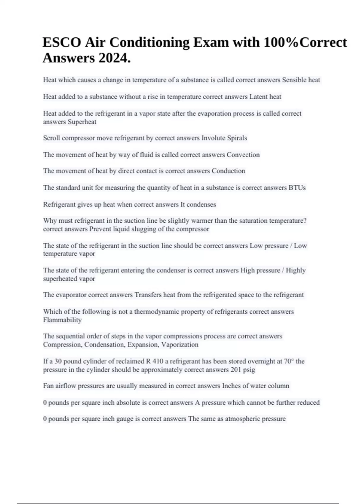 ESCO Air Conditioning Exam with 100%Correct Answers 2024. Heat which causes a change in temperature of a substance is called correct answers Sensible heat Heat added to a substance without a rise in temperature correct answers Latent heat Heat added to the refrigerant in a vapor state after the evaporation process is called correct answers Superheat Scroll compressor move refrigerant by correct answers Involute Spirals The movement of heat by way of fluid is called correct answers Convection The movement of heat by direct contact is correct answers Conduction The standard unit for measuring the quantity of heat in a substance is correct answers BTUs Refrigerant gives up heat when correct answers It condenses Why must refrigerant in the suction line be slightly warmer than the saturation temperature? correct answers Prevent liquid slugging of the compressor The state of the refrigerant in the suction line should be correct answers Low pressure / Low temperature vapor The state of the refrigerant entering the condenser is correct answers High pressure / Highly superheated vapor The evaporator correct answers Transfers heat from the refrigerated space to the refrigerant Which of the following is not a thermodynamic property of refrigerants correct answers Flammability The sequential order of steps in the vapor compressions process are correct answers Compression, Condensation, Expansion, Vaporization If a 30 pound cylinder of reclaimed R 410 a refrigerant has been stored overnight at 70° the pressure in the cylinder should be approximately correct answers 201 psig Fan airflow pressures are usually measured in correct answers Inches of water column 0 pounds per square inch absolute is correct answers A pressure which cannot be further reduced 0 pounds per square inch gauge is correct answers The same as atmospheric pressure .