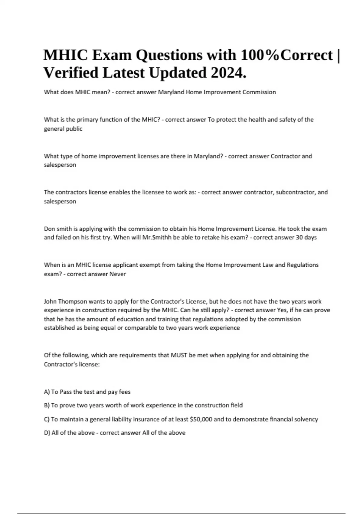 MHIC Exam Questions with 100%Correct | Verified Latest Updated 2024. What does MHIC mean? - correct answer Maryland Home Improvement Commission What is the primary function of the MHIC? - correct answer To protect the health and safety of the general public What type of home improvement licenses are there in Maryland? - correct answer Contractor and salesperson The contractors license enables the licensee to work as: - correct answer contractor, subcontractor, and salesperson Don smith is applying with the commission to obtain his Home Improvement License. He took the exam and failed on his first try. When will Mr.Smithh be able to retake his exam? - correct answer 30 days When is an MHIC license applicant exempt from taking the Home Improvement Law and Regulations exam? - correct answer Never John Thompson wants to apply for the Contractor's License, but he does not have the two years work experience in construction required by the MHIC. Can he still apply? - correct answer Yes, if he can prove that he has the amount of education and training that regulations adopted by the commission established as being equal or comparable to two years work experience Of the following, which are requirements that MUST be met when applying for and obtaining the Contractor's license: A) To Pass the test and pay fees B) To prove two years worth of work experience in the construction field C) To maintain a general liability insurance of at least $50,000 and to demonstrate financial solvency D) All of the above - correct answer All of the above.