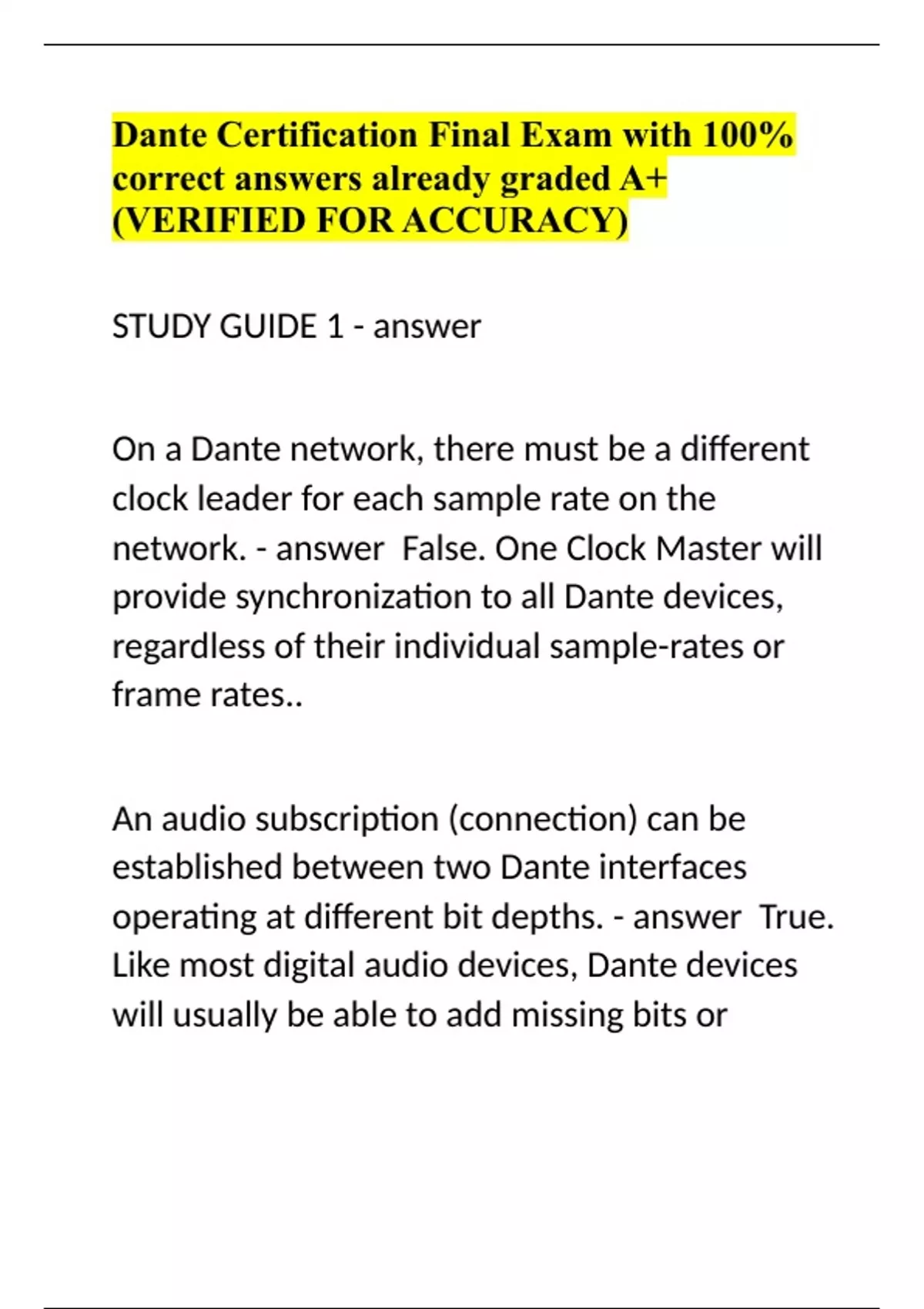 STUDY GUIDE 1 On a Dante network, there must be a different clock leader for each sample rate on the network. False. One Clock Master will provide synchronization to all Dante devices, regardless of their individual sample-rates or frame rates.. An audio subscription (connection) can be established between two Dante interfaces operating at different bit depths. True. Like most digital audio devices, Dante devices will usually be able to add missing bits or truncate extraneous bits to match the expected internal operation. The sample rate of an audio system dictates: the audio resolution in time. According to the Nyquist Theorem, the sample rate must be at least twice the highest audio frequency to be captured. The bit depth of an audio system dictates: the resolution of the audio signal's amplitude. A greater bit depth increases dynamic range. A Dante audio subscription (connection) can be established between two Dante interfaces operating at different audio sample rates False. Each Dante interface can only operate at one sample rate at a time. If a sample rate converter is employed, it will sit behind the Dante network port. Dante audio is sent: Uncompressed, bit-perfect. What audio sample rates are supported by Dante? Dante supports most common sample rates from 44.1kHz to 192kHz. If we increase the sample rate of a device from 48KHz to 96KHz, what is the impact to the network? A 96kHz subscription will require (roughly) twice as much bandwidth as a 48kHz subscription. Roughly how many channels of 24-bit, 48kHz audio can be carried on a 1 Gbps connection? 512x512 A 1Gbps network switch can manage more Dante channels than a single 1Gbps link can. True. A non-blocking network switch will be able to handle the total of all ports capacity at all times. STUDY GUIDE 2 Dante AV can support multiple codecs. However, the initial products will transport video in what format? Compressed using a visually lossless JPEG2000 codec. The JPEG 2000 codec initially included in the Dante AV module is used in 65% of digital cinema rooms today. It is visually lossless, supporting both video and computer graphics (like spreadsheets and slide presentations). True. The JPEG2000 offers sharp quality and intense colour definition with a visual accuracy adopted by most professional uses. Dante AV devices sends and receives audio uncompressed so it is completely compatible with Dante audio devices. True. As audio and video are transported separately as independent essences, it is possible for a Dante AV device to send its audio channels to a Dante Audio device and vice-versa. Interlaced video draws all the odd lines, then all the even lines. This creates two "fields" for each frame. TRUE. The interlaced signal contains two fields of a video frame captured consecutively. This enhances motion perception to the viewer, and reduces flicker. Dante AV devices have a scaler in it. What does the scaler affect? The scaler can adapt screen resolution. (i.e. - it can scale a 4K source to 1080p for display) Which answer best describes the JPEG2000 encoding process? There is a "visually lossless" impact on the first encoding, but JPEG 2000 can decode and encode over and over with no further loss. In Dante AV, with the JPEG2000 codec and a 1 Gbps connection, what resolution and frame rates are currently supported? Up to 4K (4096 x 2160) at 60fps The JPEG 2000 codec commonly used in Dante AV processes video frames in groups. If a packet is corrupted, the picture will automatically recover when the current group of frames ends and the next keyframe arrives. It could be several frames. False. The JPEG2000 codec is the best example of intraframe encoding, applying a compression algorithm to each frame captured individually, not built up from multiple frames, so they can be compressed and transmitted out quickly to reduce latency. On a Dante network, a single clock leader is established to manage all audio sample rates and video frame rates. True. A single Clock Leader on the network is able to keep all followers synchronised, regardless of their sample-rates or frame-rates. What factors significantly affect the overall bandwidth demands of a compressed video flow? (Select all that apply.) -The video frame resolution (i.e. - 1080p vs 4K) -The chroma sampling (i.e. - 4:4:4 vs 4:2:0) -The frame rate (ie 24fps vs 60fps) STUDY GUIDE 3 When using category cable, what type is recommended? CAT5e or better is recommended. What IP addressing methods are available for Dante devices? (Select all that apply.) -Static IP Addressing -DHCP Dynamic Host Configuration Protocol -Link Local Which IP Range is not designated for use on a local network? 8.8.__.__ Neutrik etherCON ports must be populated by Neutrik etherCON cables. False. The Neutrik etherCON port provides an RJ45 at the center and thus it does accept standard Ethernet cables.