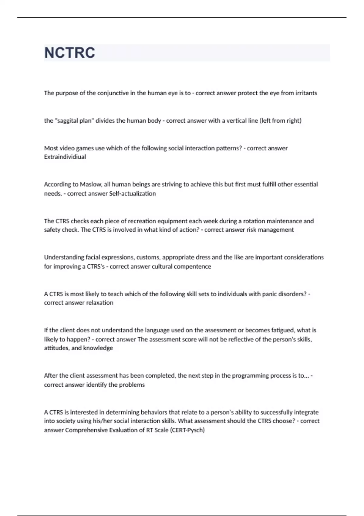 NCTRC Question and answers already passed NCTRC The purpose of the conjunctive in the human eye is to - correct answer protect the eye from irritants the "saggital plan" divides the human body - correct answer with a vertical line (left from right) Most video games use which of the following social interaction patterns? - correct answer Extraindividiual According to Maslow, all human beings are striving to achieve this but first must fulfill other essential needs. - correct answer Self-actualization The CTRS checks each piece of recreation equipment each week during a rotation maintenance and safety check. The CTRS is involved in what kind of action? - correct answer risk management Understanding facial expressions, customs, appropriate dress and the like are important considerations for improving a CTRS's - correct answer cultural compentence A CTRS is most likely to teach which of the following skill sets to individuals with panic disorders? - correct answer relaxation If the client does not un