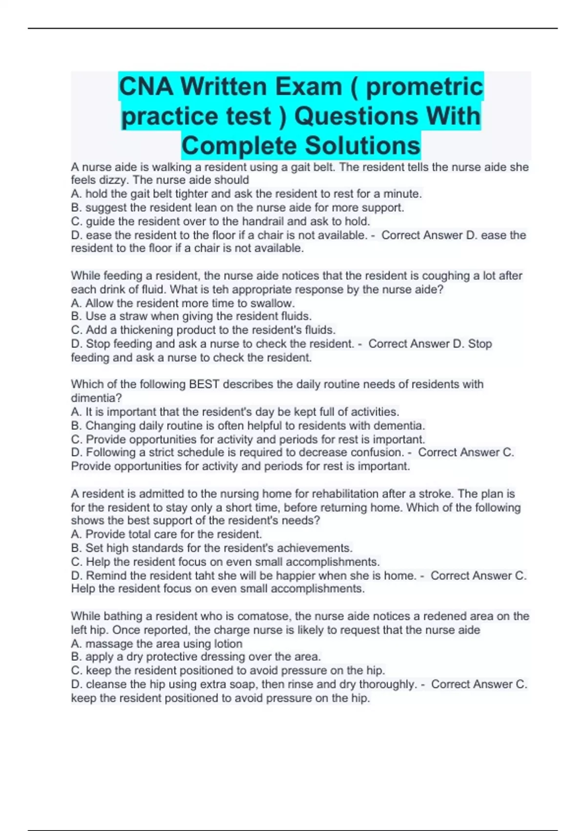 CNA Written Exam ( prometric practice test ) Questions With Complete Solutions A nurse aide is walking a resident using a gait belt. The resident tells the nurse aide she feels dizzy. The nurse aide should A. hold the gait belt tighter and ask the resident to rest for a minute. B. suggest the resident lean on the nurse aide for more support. C. guide the resident over to the handrail and ask to hold. D. ease the resident to the floor if a chair is not available. - Correct Answer D. ease the resident to the floor if a chair is not available. While feeding a resident, the nurse aide notices that the resident is coughing a lot after each drink of fluid. What is teh appropriate response by the nurse aide? A. Allow the resident more time to swallow. B. Use a straw when giving the resident fluids. C. Add a thickening product to the resident's fluids. D. Stop feeding and ask a nurse to check the resident. - Correct Answer D. Stop feeding and ask a nurse to check the resident. Which of the following BEST describes the daily routine needs of residents with dimentia? A. It is important that the resident's day be kept full of activities. B. Changing daily routine is often helpful to residents with dementia. C. Provide opportunities for activity and periods for rest is important. D. Following a strict schedule is required to decrease confusion. - Correct Answer C. Provide opportunities for activity and periods for rest is important. A resident is admitted to the nursing home for rehabilitation after a stroke. The plan is for the resident to stay only a short time, before returning home. Which of the following shows the best support of the resident's needs? A. Provide total care for the resident. B. Set high standards for the resident's achievements. C. Help the resident focus on even small accomplishments. D. Remind the resident taht she will be happier when she is home. - Correct Answer C. Help the resident focus on even small accomplishments. While bathing a resident who is comatose, the nurse aide notic