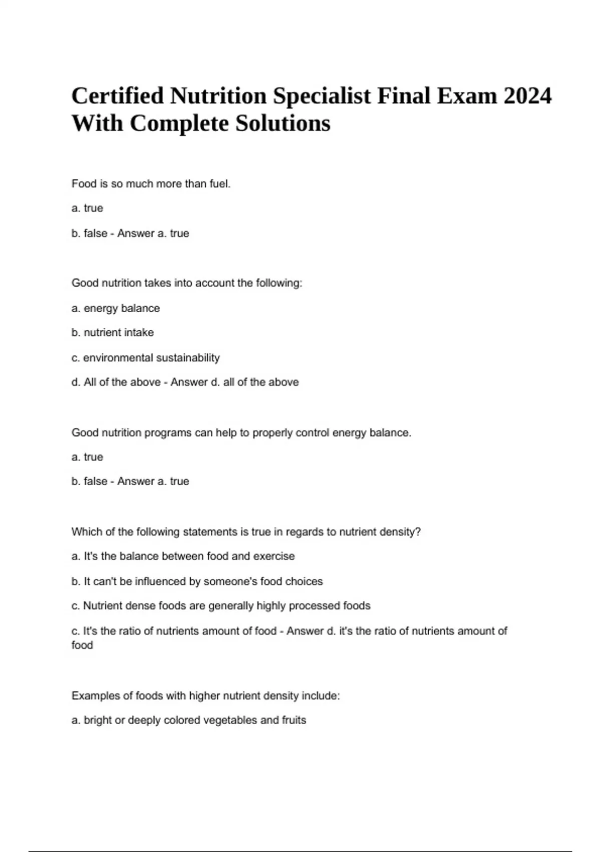 Certified Nutrition Specialist Final Exam 2024 With Complete Solutions. Food is so much more than fuel. a. true b. false - Answer a. true Good nutrition takes into account the following: a. energy balance b. nutrient intake c. environmental sustainability d. All of the above - Answer d. all of the above Good nutrition programs can help to properly control energy balance. a. true b. false - Answer a. true Which of the following statements is true in regards to nutrient density? a. It's the balance between food and exercise b. It can't be influenced by someone's food choices c. Nutrient dense foods are generally highly processed foods c. It's the ratio of nutrients amount of food - Answer d. it's the ratio of nutrients amount of food Examples of foods with higher nutrient density include: a. bright or deeply colored vegetables and fruits Certified Nutrition Specialist Final Exam 2024 With Complete Solutions b. white flour c. ice cream - Answer a. bright or deeply colored vegetables and fruits Limiting factors for clients may include their genetic makeup, their physical activity patterns, or their mindset. a. true b. false - Answer a. true To achieve great results with a client, it's important to identify their: a. vitamin A levels b. blood cholesterol c. vertical jump d. limiting factors - Answer d. limiting factors Your clients can improve despite their genetics: a. true b. false - Answer a. true Focusing exclusively on body composition when making nutrition choices is always healthy. a. true b. false - Answer b. false Good nutrition includes using ____ to inform future decisions. a. supplements b. outcomes c. newspapers d. diet plans - Answer b. outcomes This course qualifies you to legally offer Medical Nutrition Therapy. a. true b. false - Answer b. false There is a single best diet for everyone. a. true b. false - Answer b. false Sustainable agriculture involved things like: a. preserving and replenishing soil b. preserving water c. making animal welfare a priority d. all of the above - Answer d. all of the above A good nutrition coach: a. is client centered, helps clients take action, and is continually learning. b. has a stock diet plan for all clients, and is set in their ways c. doesn't care about the scope of practice d. focuses exclusively on macronutrient intake with clients. - Answer a. is client centered, helps clients take action, and is continually learning. All living tissues are built from ___. a. exercise b. minerals c. vitamins d. cells - Answer d. cells Metabolism refers to all of the cellular tasks that contribute to life. a. true b. false - Answer a. true An example of an organism would be: a. a nucleus b. a human being c. skin d. a kidney - Answer b. a human being.