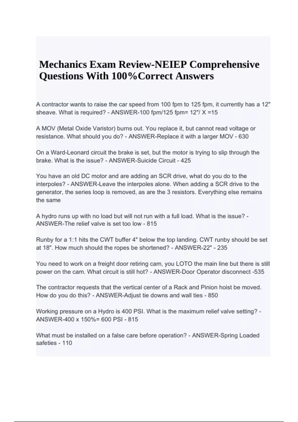 Mechanics Exam Review-NEIEP Comprehensive Questions With 100%Correct Answers. A contractor wants to raise the car speed from 100 fpm to 125 fpm, it currently has a 12" sheave. What is required? - ANSWER-100 fpm/125 fpm= 12"/ X =15 A MOV (Metal Oxide Varistor) burns out. You replace it, but cannot read voltage or resistance. What should you do? - ANSWER-Replace it with a larger MOV - 630 On a Ward-Leonard circuit the brake is set, but the motor is trying to slip through the brake. What is the issue? - ANSWER-Suicide Circuit - 425 You have an old DC motor and are adding an SCR drive, what do you do to the interpoles? - ANSWER-Leave the interpoles alone. When adding a SCR drive to the generator, the series loop is removed, as are the 3 resistors. Everything else remains the same A hydro runs up with no load but will not run with a full load. What is the issue? - ANSWER-The relief valve is set too low - 815 Runby for a 1:1 hits the CWT buffer 4" below the top landing. CWT runby should be set at 18". How much should the ropes be shortened? - ANSWER-22" - 235 You need to work on a freight door retiring cam, you LOTO the main line but there is still power on the cam. What circuit is still hot? - ANSWER-Door Operator disconnect -535 The contractor requests that the vertical center of a Rack and Pinion hoist be moved. How do you do this? - ANSWER-Adjust tie downs and wall ties - 850 Working pressure on a Hydro is 400 PSI. What is the maximum relief valve setting? - ANSWER-400 x 150%= 600 PSI - 815 What must be installed on a false care before operation? - ANSWER-Spring Loaded safeties - 110 Mechanics Exam Review-NEIEP Comprehensive Questions With 100%Correct Answers There is slight arcing between the brush and commutator. What action must be taken? - ANSWER-None Note: Heavy arcing= light brush pressure, Heavy brush pressure= mechanical wear If rigging is roped 3:1 and a BEAM CLAMP is used to lift a 6,000lb load. What is the beam capacity? - ANSWER-18,000lbs -210 How much resistance is measured over a normally closed switch? - ANSWER-.2 Ohmsshould be zero but will never be that low A car traveling in the hoistway always stops at the same spot and blows a fuse. What causes this? - ANSWER-traveling cable has a cut/exposed wire or a short - 515 How is a class 1 yearly buffer test preformed? - ANSWER-Car at the bottom landing and on inspection, jump out direction and final limits. With pit clear, run down to compress the buffers, buffers should fully extend within 90 seconds. Note: 5 yr is Full load, full speed - 555 How many strain supports are required on a 350 ft raceway? - ANSWER-4 1 every 100ft - 505-510 How is stainless steel drilled out? - ANSWER-Slow speed and constant pressure - 205 What is the required amout of retainer clips for wedge shackles and what is the spacing? - ANSWER-At least 2. First clip being 4 times the diameter of the rope from the top of the shackle, and the second clip is 8 times the diameter of the rope away from the shackle. - 245 A 300 ohm resistor burns out, but you dont have another one. How can you make one? - ANSWER-2- 600 ohms resistors in parallel is 300 ohms. Resistance is half of the highest resistor in the parallel circuit. 3- 225 ohms is 75 ohms. - 345 When cutting laminated panels, which direction should the finish side face? - ANSWER-Finish side facing the cutting edge of the tool. Blade will burr the backside. - 225 How do you cut a finished floor? - ANSWER-Cutting blade away from the finished side - 255 A 480 VAC stepdown 240 VAC transformer is connected to a 3 phase rectifier, what is the output voltage? - ANSWER-320 VAC 3 phase full wave= 1.33 x output voltage. - 715 A car is loaded with 125% and sinks, why? - ANSWER-Slipping through the brake IF you find a broken or missing barricade what should you do? - ANSWER-Write up a formal inspection request What are the consequences of misaligned joints on a rack and pinion? - ANSWER-Broken gear teeth. CWT derailment. Excessive wear/crease the surface of the tube. - 850 A dumbwaiter is 9 sqft in area, 4 ft in height, and capacity is 13.9lb/ft. What is the total capacity? - ANSWER-9 X 4 x 13.9= 500lbs Max Capacity You must enter a pit with a toxic atmosphere, how do you proceed? - ANSWER-Follow proper OSHA procedure with proper training and PPE - 133 When changing a 1:1 car rated at 600fpm and 2,000lb capacity to a 2:1, what are the new ratings? - ANSWER-300 fpm with 4000lbs capacity. Half the speed and double the capacity. A vertical platform lift has a clearance of 1 inch. How much will it have to move to meet code? - ANSWER-Move in 1/4 inch. Code is 3/4 in A car weighs 2500lbs with a capacity of 2500lbs, The CWT is weighted 40% , how much is the motor lifting when the car is fully loaded? - ANSWER-2500 (CAR) + 1000 ( 40%)= 3500lbs = 1500lbs lifted by the machine - 240 How must Oxygen and Acetylene tanks be stored? - ANSWER-Vertically, 12 feet apart, or on a cart with a ½ hour fire barrier between them.