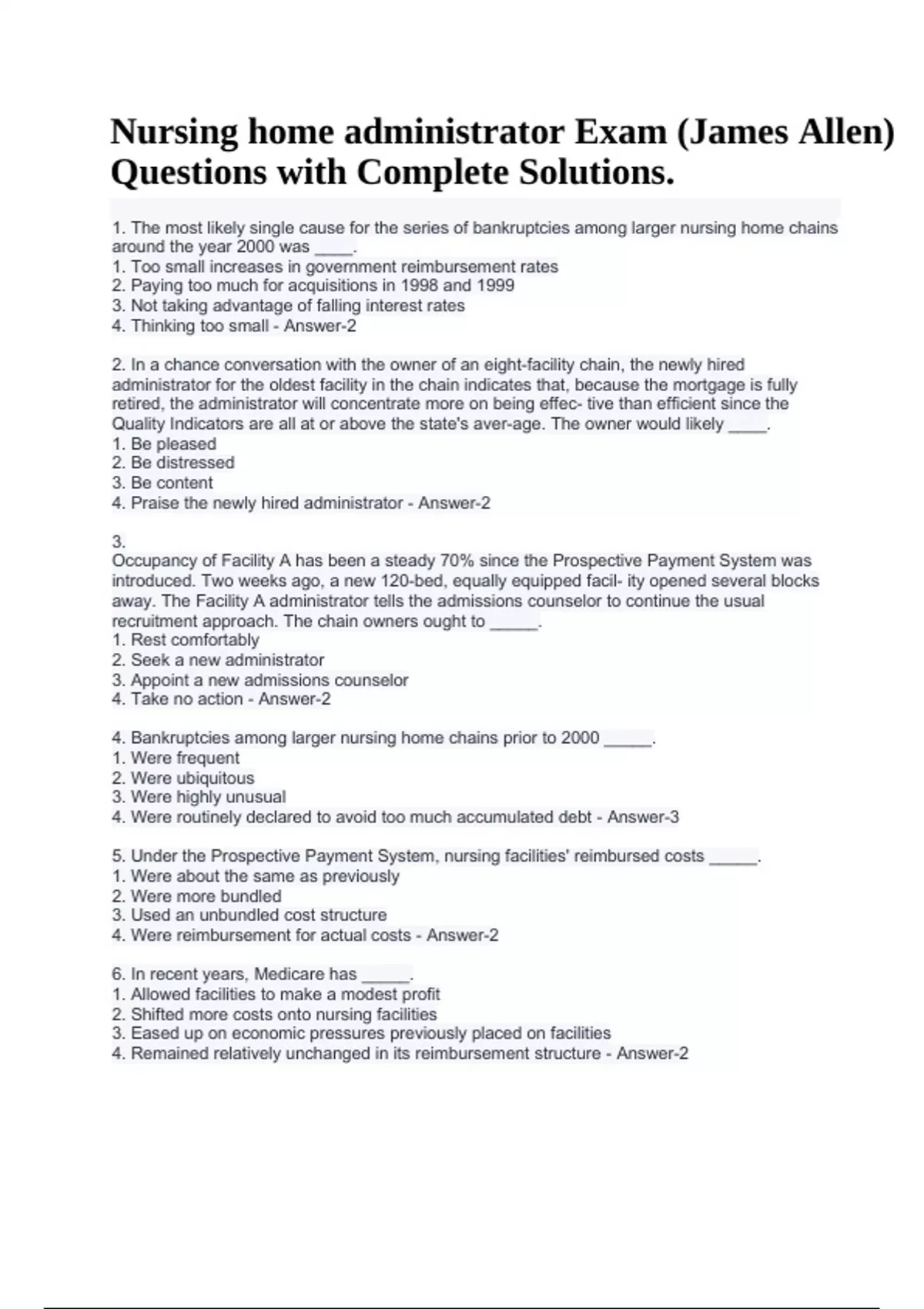 Nursing home administrator Exam (James Allen) Questions with Complete Solutions. 1. The most likely single cause for the series of bankruptcies among larger nursing home chains around the year 2000 was ____. 1. Too small increases in government reimbursement rates 2. Paying too much for acquisitions in 1998 and 1999 3. Not taking advantage of falling interest rates 4. Thinking too small - Answer-2 2. In a chance conversation with the owner of an eight-facility chain, the newly hired administrator for the oldest facility in the chain indicates that, because the mortgage is fully retired, the administrator will concentrate more on being effec- tive than efficient since the Quality Indicators are all at or above the state's aver-age. The owner would likely ____. 1. Be pleased 2. Be distressed 3. Be content 4. Praise the newly hired administrator - Answer-2 3. Occupancy of Facility A has been a steady 70% since the Prospective Payment System was introduced. Two weeks ago, a new 120-bed, equally equipped facil- ity opened several blocks away. The Facility A administrator tells the admissions counselor to continue the usual recruitment approach. The chain owners ought to _____. 1. Rest comfortably 2. Seek a new administrator 3. Appoint a new admissions counselor 4. Take no action - Answer-2 4. Bankruptcies among larger nursing home chains prior to 2000 _____. 1. Were frequent 2. Were ubiquitous 3. Were highly unusual 4. Were routinely declared to avoid too much accumulated debt - Answer-3 5. Under the Prospective Payment System, nursing facilities' reimbursed costs _____. 1. Were about the same as previously 2. Were more bundled 3. Used an unbundled cost structure 4. Were reimbursement for actual costs - Answer-2 6. In recent years, Medicare has _____. 1. Allowed facilities to make a modest profit 2. Shifted more costs onto nursing facilities 3. Eased up on economic pressures previously placed on facilities 4. Remained relatively unchanged in its reimbursement structure - Answer-2 Nursing home administrator Exam (James Allen) Questions with Complete Solutions. 7. The nurse newly promoted to director of nursing insists on giving four RN hours of patient care each day on the Alzheimer's wing in the 175-bed facility. The administrator should _____. 1. Praise the new director of nursing for her resident centeredness 2. Appoint an assistant director of nursing 3. Adapt the job description to fit her pattern 4. Seek a new director of nursing - Answer-4 8. The applicant for the administrator position in a facility near a large teaching hospital insists that, as before in his rural facility, if hied he would not let the Medicare reimbursement policies affect his case mix. This applicant _____. 1. Should be hired 2. Is likely to succeed if hired 3. Can likely succeed in his goal 4. Is out of touch - Answer-4 9. The newly hired assistant to the administrator insists that the organizational chart dotted line between this position and the Department of Nursing be a solid line. The administrator should _____. 1. Agree in general 2. Agree to this special case 3. Ask the director of nursing for his or her opinion 4. Be forewarned - Answer-4 10. The medical supplies provider tells the administrator of a facility that has not paid bills for the past 3 months but is now operating under a bankruptcy judge's approved plan for restructuring, that no more deliveries will be made until past bills are fully paid. The medical supplies provider _____. 1. Is smart to cut losses at that point 2. Does not understand how bankruptcy works 3. Will now likely get his past due bills paid 4. Is farsighted - Answer-2 11. An administrator who adopts the leadership-by-walking-around (LBWA) approach by walking through the facility weekly and intently observing has _____. 1. Become an effective leader 2. Chosen a good management style 3. Failed to understand LBWA 4. Implemented a useful strategy - Answer-3 12. The nursing facility administrator who, using the leadership-by-walking around (LBWA) technique, succeeds in actually making appropriate corrections on the spot during her rounds _____. 1. Is effectively implementing the concept 2. Gains additional power through the process 3. Exhibits appropriate leadership 4. Does not understand LBWA - Answer-4 13. The rate of increase in the total number of nursing facilities in the United States during the years 2008 to 2012 is _____. 1. Likely to be about level 2. Likely to double 3. Likely to triple to accommodate the baby boomer generation 4. Likely to decrease markedly - Answer-1 14. The applicant for administrator of the facility insists that he has successfully used democratic leadership to the exclusion of all other leadership styles. The interviewer should _____. 1. Recommend hiring this candidate 2. Praise the candidate 3. Be favorably impressed 4. Continue to interview candidates - Answer-4 15. The candidate for administrator said that she used a variety of administrative styles, but could not say exactly which she would use in every circumstance. The interviewer should be _____. 1. Favorably impressed 2. Unfavorably impressed 3. Concerned about possible indecisiveness 4. Looking for one leadership style - Answer-1 16. The candidate for administrator indicated that he consistently chose the charis- matic style of leadership. This should _____ the interviewer. 1. Reassure 2. Alert 3. Confirm the candidate's qualifications to 4. Please - Answer-2 17. The costs of providing subacute care to nursing home residents _____. 1. Is perhaps triple that of the more typical patient 2. Covered by Medicare 3. Absorbed by Medicaid if Medicare coverage is inadequate 4. Mostly covered by private insurance - Answer-1 18. The nurse supervisor who had just been appointed director of nursing announced at the first department head meeting that she had circulated a memo among the nurses that only formal communications were to be allowed in the nursing department. The administrator should _____. 1. Be r