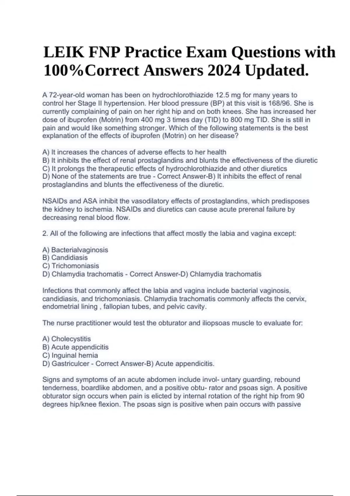 LEIK FNP Practice Exam Questions with 100%Correct Answers 2024 Updated. A 72-year-old woman has been on hydrochlorothiazide 12.5 mg for many years to control her Stage II hypertension. Her blood pressure (BP) at this visit is 168/96. She is currently complaining of pain on her right hip and on both knees. She has increased her dose of ibuprofen (Motrin) from 400 mg 3 times day (TID) to 800 mg TID. She is still in pain and would like something stronger. Which of the following statements is the best explanation of the effects of ibuprofen (Motrin) on her disease? A) It increases the chances of adverse effects to her health B) It inhibits the effect of renal prostaglandins and blunts the effectiveness of the diuretic C) It prolongs the therapeutic effects of hydrochlorothiazide and other diuretics D) None of the statements are true - Correct Answer-B) It inhibits the effect of renal prostaglandins and blunts the effectiveness of the diuretic. NSAIDs and ASA inhibit the vasodilatory effects of prostaglandins, which predisposes the kidney to ischemia. NSAIDs and diuretics can cause acute prerenal failure by decreasing renal blood flow. 2. All of the following are infections that affect mostly the labia and vagina except: A) Bacterialvaginosis B) Candidiasis C) Trichomoniasis D) Chlamydia trachomatis - Correct Answer-D) Chlamydia trachomatis Infections that commonly affect the labia and vagina include bacterial vaginosis, candidiasis, and trichomoniasis. Chlamydia trachomatis commonly affects the cervix, endometrial lining , fallopian tubes, and pelvic cavity. The nurse practitioner would test the obturator and iliopsoas muscle to evaluate for: A) Cholecystitis B) Acute appendicitis C) Inguinal hernia D) Gastriculcer - Correct Answer-B) Acute appendicitis. Signs and symptoms of an acute abdomen include invol- untary guarding, rebound tenderness, boardlike abdomen, and a positive obtu- rator and psoas sign. A positive obturator sign occurs when pain is elicted by internal rotation of the right hip from 90 degrees hip/knee flexion. The psoas sign is positive when pain occurs with passive LEIK FNP Practice Exam Questions with 100%Correct Answers 2024 Updated. extension of the thigh while the patient is lying on his/her side with knees extended, or when pain occurs with active flexion of his/her thigh at the hip. Treatment for mild preeclampsia includes all of the following except: A) Bed rest except for bathroom privileges B) Close monitoring of weight and blood pressure C) Close follow-up of urinary protein, serum creatinine, and platelet count D) A prescription of methyldopa (Aldomet) to control blood pressure - Correct AnswerD) A prescription of methyldopa (Aldomet) to control blood pressure Recommended care for women diagnosed with preeclampsia includes bed rest with bath- room privileges, weight and BP monitoring, and closely following urine protein and serum protein, creatinine, and platelet counts. Oral medications are not used as first-line treatment. All of the following services are covered under Medicare Part A except: A) Inpatienthospitalizations B) Medicines administered to a patient while hospitalized C) Nursing home care D) Surgeons - Correct Answer-C) Nursing home care Medicare A coverage includes inpatient hospitalization and skilled care given in a certified skilled nursing facility. Most nursing home care is custodial care (help with bathing, dressing, using a bathroom, and eating). This care is not covered by Medicare A. A 28-year-old student is seen in the school health clinic with complaints of a hacking cough that is productive of small amounts of sputum and a runny nose. He does not take any medications, denies any allergies, and has no significant medical history. Physical examination reveals a low-grade temperature of 99.9 degrees Fahrenheit, respirations of 16/min, a pulse of 90 beats per minute, and diffuse fine crackles in the base of the lungs. A chest radiograph (x-ray) shows diffuse infiltrates on the lower lobe of the right lung. The total white blood cell count is 10,500/uL. What is the most likely diagnosis? A) Streptococcal pneumonia B) Mycoplasma pneumonia C) Acute bronchitis D) Legionnaires disease - Correct Answer-B) Mycoplasma pneumonia Mycoplasma pneumonia is the organism most com- monly seen in children and young adults. It is easily spread from droplets, from sneezing and coughing, in close proximity. Diagnosis is based on symptoms and x-ray results of infiltrates in lower lobes. A 39-year-old migrant worker presents to the clinic 2.5 days after a purified protein derivative (PPD) test. What minimum size of induration would be considered posi- tive for this patient? A) 3 mm B) 5 mm C) 10 mm D) 15 mm - Correct Answer-C) 10 mm The PPD is administered on the volar aspect of the lower arm and read 48 hours after the test is given. The PPD result must have induration and measure 10 mm or greater to be positive in a low-risk patient. Induration (firmness with palpation) must be present. If the site has erythema but no induration, result would be negative. Color is not important. All of the following are correct statements regarding the role of the person named in a durable power of attorney except: A) The agent's decisions are legally binding B) The agent can make decisions in other areas of the patient's life such as financial issues C) The agent can decide for the patient who is on life support when that life support can be terminated D) The patient's spouse has a right to override the agent's decisions - Correct AnswerD) The patient's spouse has a right to override the agent's decisions The person named in a durable power of attorney (the agent) is designated by the patient to make all medical decisions, as well as any decisions regarding the patient's private affairs in the event that the patient becomes incompetent and unable to make his/her own decisions. No one has the ability to override the agent's decision. All of the following are true statements re