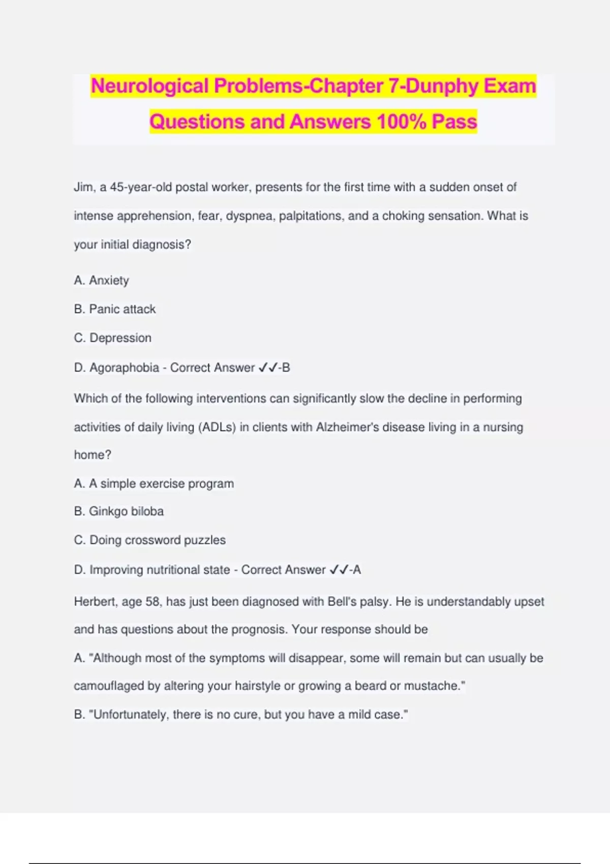 Neurological Problems-Chapter 7-Dunphy Exam Questions and Answers 100% Pass Jim, a 45-year-old postal worker, presents for the first time with a sudden onset of intense apprehension, fear, dyspnea, palpitations, and a choking sensation. What is your initial diagnosis? A. Anxiety B. Panic attack C. Depression D. Agoraphobia - Correct Answer ️️ -B Which of the following interventions can significantly slow the decline in performing activities of daily living (ADLs) in clients with Alzheimer's disease living in a nursing home? A. A simple exercise program B. Ginkgo biloba C. Doing crossword puzzles D. Improving nutritional state - Correct Answer ️️ -A Herbert, age 58, has just been diagnosed with Bell's palsy. He is understandably upset and has questions about the prognosis. Your response should be A. "Although most of the symptoms will disappear, some will remain but can usually be camouflaged by altering your hairstyle or growing a beard or mustache." B. "Unfortunately, there is no cure, but you have a mild case." C. "The condition is self-limiting, and most likely complete recovery will occur." D. "With suppressive drug therapy, you can minimize the symptoms." - Correct Answer ️️ -C Major depression occurs most often in which of the following conditions? A. Parkinson's disease B. Alzheimer's disease C. Myocardial infarction D. Brain attack (stroke) - Correct Answer ️️ -D Bob, age 49, is complaining of recurrent, intrusive dreams since returning from his Marine combat training. You suspect A. Depersonalization B. Schizophrenia C. Post-traumatic stress disorder D. Anxiety - Correct Answer ️️ -C Sam, age 29, has lost his sense of smell. You would document this as A. Hyposmia B. Anosmia C. Ageusia D. Agnosia - Correct Answer ️️ -B Which drug effective in supporting smoking cessation is the appropriate choice for a patient with a history epilepsy? A. Oxazepam (Serax) B. Bupropion (Zyban) C. Varenicline (Chantix) D. Alprazolam (Xanax) - Correct Answer ️️ -C A video swallow is ordered for James, a client with senile dementia of the Alzheimer's type, because he is at risk for which complication that often results in death? A. Pneumonia B. Delirium C. Aphasia D. Hyperthyroidism - Correct Answer ️️ -A Ed, age 50, has a chronic, episodic headache. He states that it can wake him up at night, lasts 15 minutes to 3 hours, and has occurred daily over a period of 4-8 weeks. You suspect a A. Tension headache B. Migraine headache C. Cluster headache D. Potential brain tumor - Correct Answer ️️ -C Marian, age 39, has multiple sclerosis (MS). She tells you that s