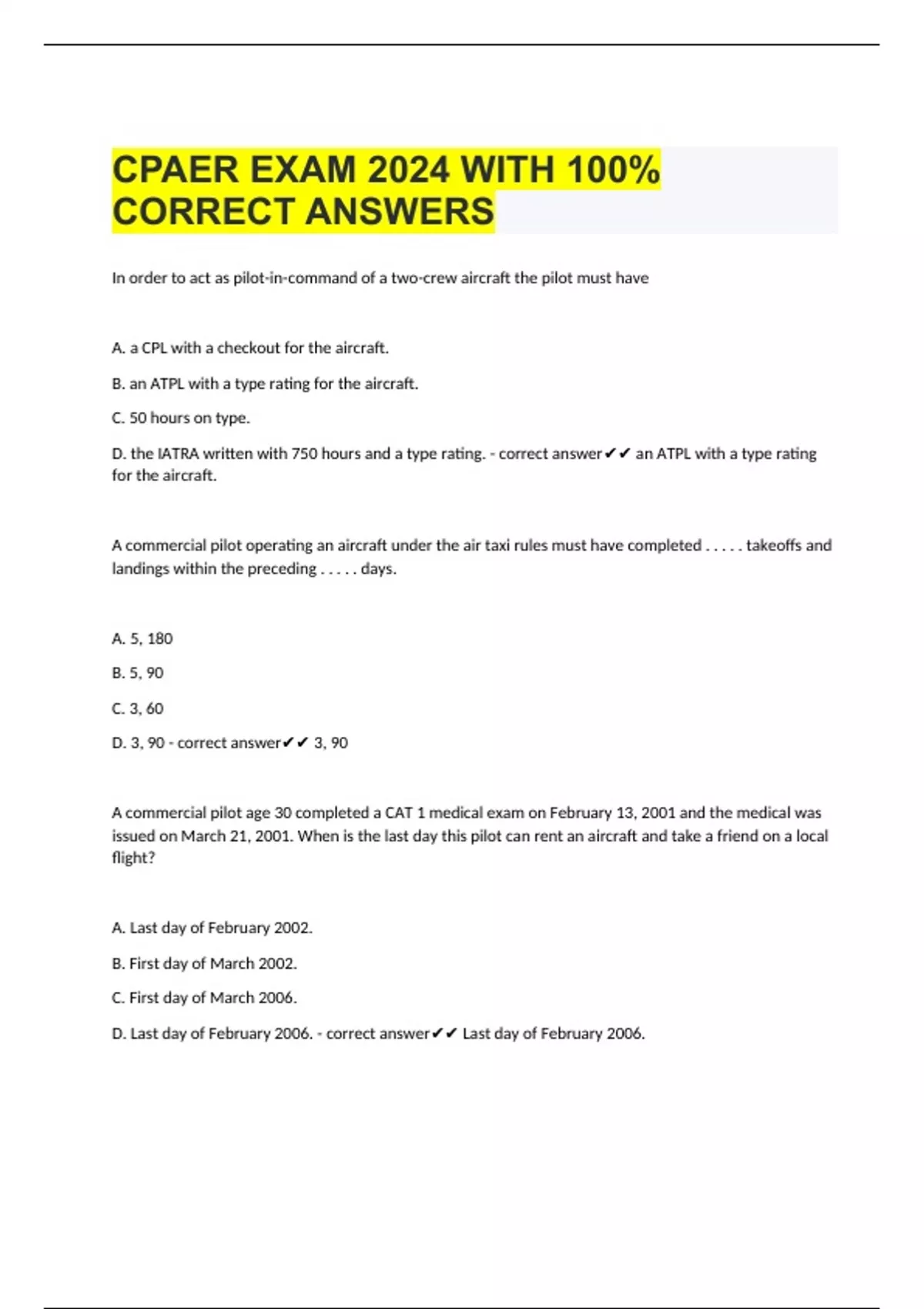 CPAER EXAM 2024 WITH 100% CORRECT ANSWERS In order to act as pilot-in-command of a two-crew aircraft the pilot must have A. a CPL with a checkout for the aircraft. B. an ATPL with a type rating for the aircraft. C. 50 hours on type. D. the IATRA written with 750 hours and a type rating. - correct answer an ATPL with a type rating for the aircraft. A commercial pilot operating an aircraft under the air taxi rules must have completed . . . . . takeoffs and landings within the preceding . . . . . days. A. 5, 180 B. 5, 90 C. 3, 60 D. 3, 90 - correct answer 3, 90 A comm