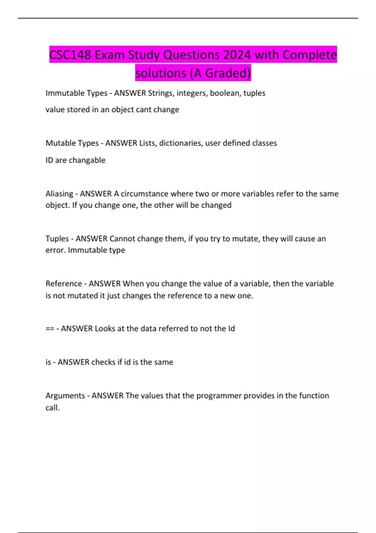 CSC148 Exam Study Questions 2024 with Complete solutions (A Graded)