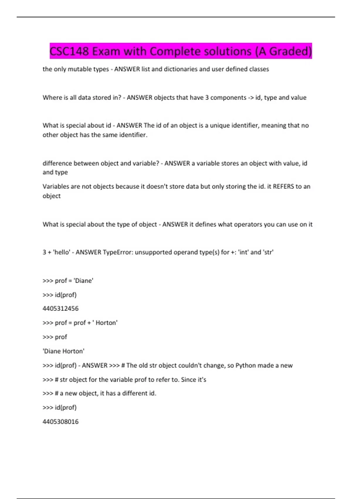 the only mutable types - ANSWER list and dictionaries and user defined classes Where is all data stored in? - ANSWER objects that have 3 components -> id, type and value What is special about id - ANSWER The id of an object is a unique identifier, meaning that no other object has the same identifier. difference between object and variable? - ANSWER a variable stores an object with value, id and type Variables are not objects because it doesn't store data but only storing the id. it REFERS to an object