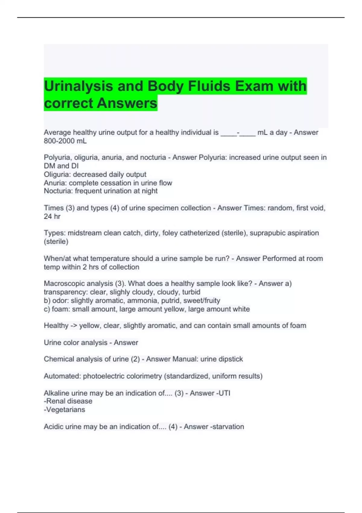 Urinalysis and Body Fluids Exam with correct Answers (Graded A)