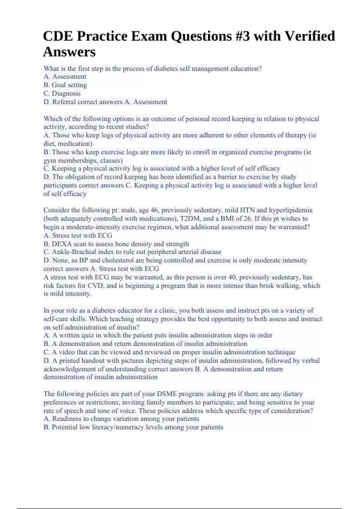 CDE Practice Exam Questions #3 with Verified Answers. What is the first step in the process of diabetes self management education? A. Assessment B. Goal setting C. Diagnosis D. Referral correct answers A. Assessment Which of the following options is an outcome of personal record keeping in relation to physical activity, according to recent studies? A. Those who keep logs of physical activity are more adherent to other elements of therapy (ie diet, medication) B. Those who keep exercise logs are more likely to enroll in organized exercise programs (ie gym memberships, classes) C. Keeping a physical activity log is associated with a higher level of self efficacy D. The obligation of record keeping has been identified as a barrier to exercise by study participants correct answers C. Keeping a physical activity log is associated with a higher level of self efficacy Consider the following pt: male, age 46, previously sedentary, mild HTN and hyperlipidemia (both adequately controlled with medications), T2DM, and a BMI of 26. If this pt wishes to begin a moderate-intensity exercise regimen, what additional assessment may be warranted? A. Stress test with ECG B. DEXA scan to assess bone density and strength C. Ankle-Brachial index to rule out peripheral arterial disease D. None, as BP and cholesterol are being controlled and exercise is only moderate intensity correct answers A. Stress test with ECG A stress test with ECG may be warranted, as this person is over 40, previously sedentary, has risk factors for CVD, and is beginning a program that is more intense than brisk walking, which is mild intensity. In your role as a diabetes educator for a clinic, you both assess and instruct pts on a variety of self-care skills. Which teaching strategy provides the best opportunity to both assess and instruct on self-administration of insulin? A. A written quiz in which the patient puts insulin administration steps in order B. A demonstration and return demonstration of insulin administration C. A video that can be viewed and reviewed on proper insulin administration technique D. A printed handout with pictures depicting steps of insulin administration, followed by verbal acknowledgement of understanding correct answers B. A demonstration and return demonstration of insulin administration The following policies are part of your DSME program: asking pts if there are any dietary preferences or restrictions; inviting family members to participate; and being sensitive to your rate of speech and tone of voice. These policies address which specific type of consideration? A. Readiness to change variation among your patients B. Potential low literacy/numeracy levels among your patients CDE Practice Exam Questions #3 with Verified Answers C. Cultural characteristics/barriers of your population D. Poor family and social support correct answers C. Cultural characteristics/barriers of your population According to the ADA consensus statement on managing preexisting diabetes for pregnancy (2008), what is the optimal glycemic target for pregnant women with preexisting diabetes (assuming the target may be reached without excessive hypoglycemia)? A. Pre-meal/fasting glucose: 60 to 90 mg/dL; peak postprandial <120 mg/dL; A1C <5.5% B. Pre-meal/fasting glucose: 60 to 99 mg/dL; peak postprandial <129 mg/dL; A1C <6% C. Pre-meal/fasting glucose: 70 to 100 mg/dL; peak postprandial <120 mg/dL; A1C <6.5% D. Pre-meal/fasting glucose: 70 to 110 mg/dL; peak postprandial <140 mg/dL; A1C <7% correct answers B. Pre-meal/fasting glucose: 60 to 99 mg/dL; peak postprandial <129 mg/dL; A1C <6% UPDATED 2019: Fasting <95 mg/dL; 1 hr post prandial <140 mg/dL; 2 hr post prandial <120 mg/dL; A1C <6% During the initial assessment process, your pt answers the question, "How important is it for you to make this change right now?" with a 9 our of 10 (very important) and answers the question, "How confident are you that you will be able to make this change?" with a 2 out of 10 (not very confident). In customizing hr DSME plan, what should your focus be? A. Providing materials and experiences to enhance her knowledge and skills B. Addressing psychosocial needs, such as accepting her diagnosis and managing stress levels C. Highlighting the benefits of good diabetes management as a way to encourage behavior change D. Explaingin the two questions further to confirm understanding, as it is very uncommon for a pt to rate the readiness to change elements this far apart correct answers A. Providing materials and experiences to enhance her knowledge and skills It is important to assess potential barriers to self-monitoring of bg, especially for pts who are not adhering to their plan of care recommendations. Which of the following barriers was NOT one cited by patients in recent studies? A. Cost of testing supplies B. Discomfort of finger sticks C. Lack of instruction and support D. Misplacement of small items correct answers D. Misplacement of small items When assessing for risk of hypoglycemia in relation to exercise, which element of the patient record is most important to consider? A. The patients typical signs and symptoms with hypoglycemia B. Current patient physical/glycemic status (wt, BMI, A1C) C. Timing and content (ie carb content) of meals in relation to activity D. Medication regimen: types, dose, and timing correct answers D. Medication regimen: types, dose, and timing Which of the following behaviors is the MOST likely indication that the pt is at a very low level of readiness to change? A. The pt becomes tearful as you explain how to keep a food diary B. The pt watches your demonstration but does not say anything C. The pt volunteers to answer a review question at the end of class but gets the answer wrong D. The pt denies that she has diabetes and disagrees with the doctor's referral to DSME correct answers D. The pt denies that she has diabetes and disagrees with the doctor's referral to DSME According to ADA Standards, which statement is NOT